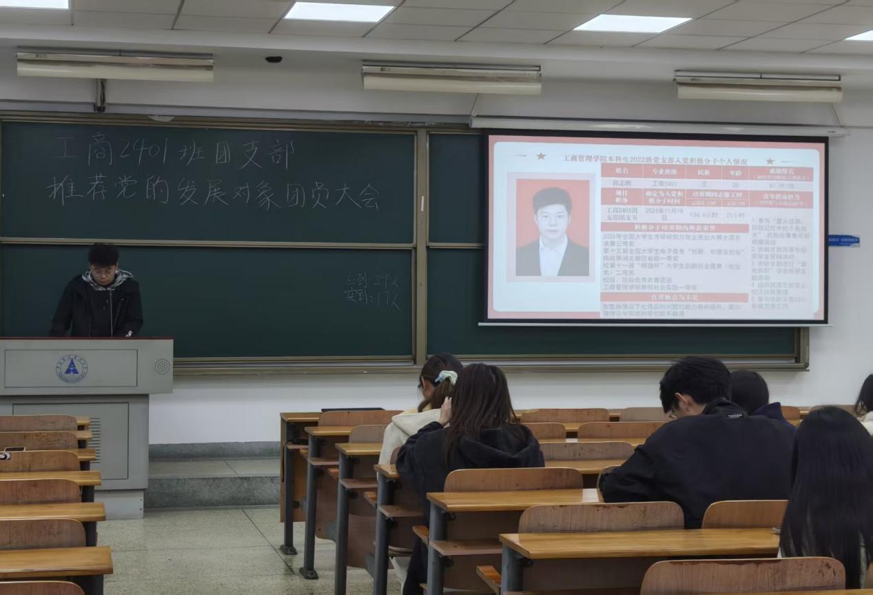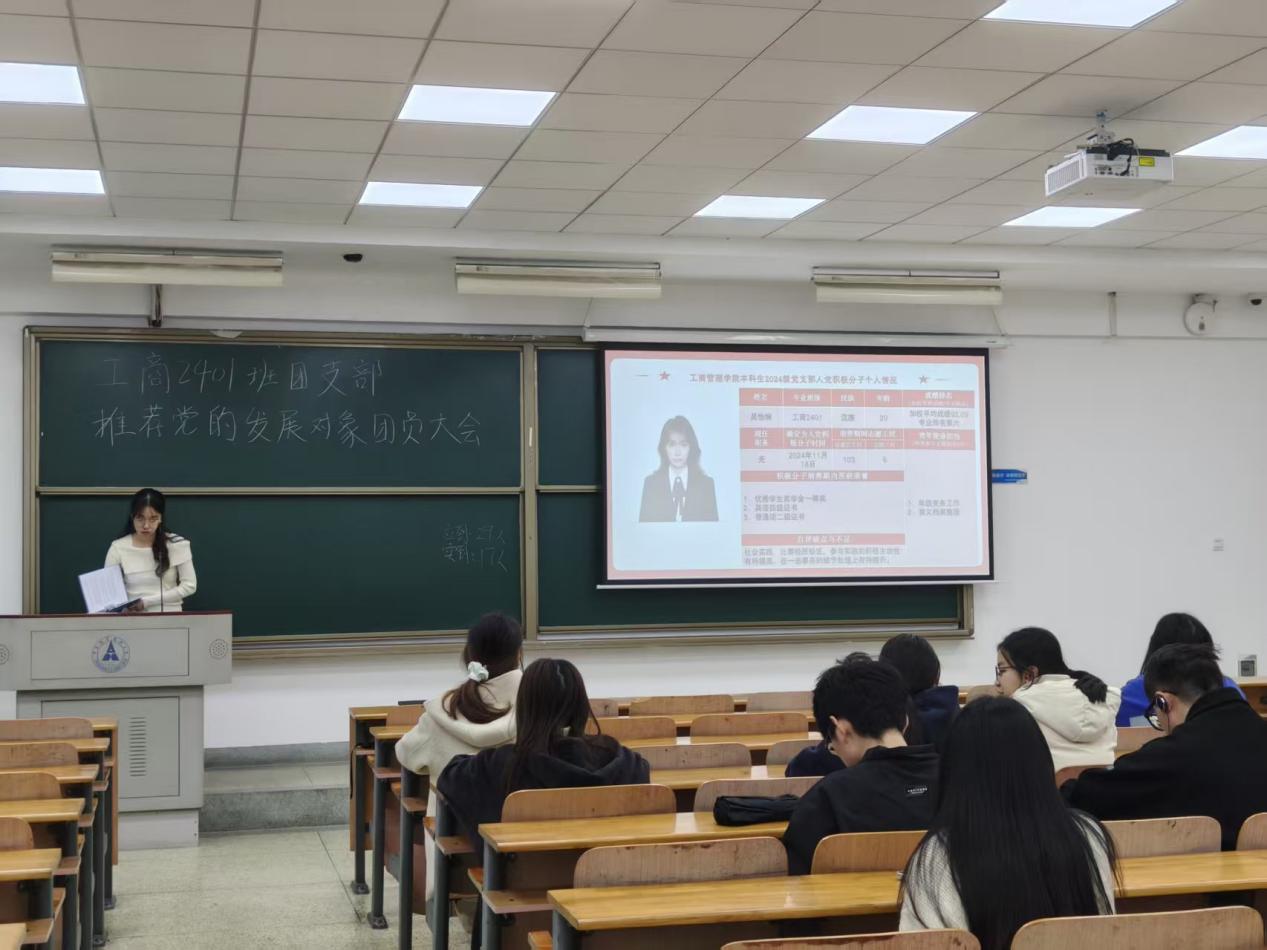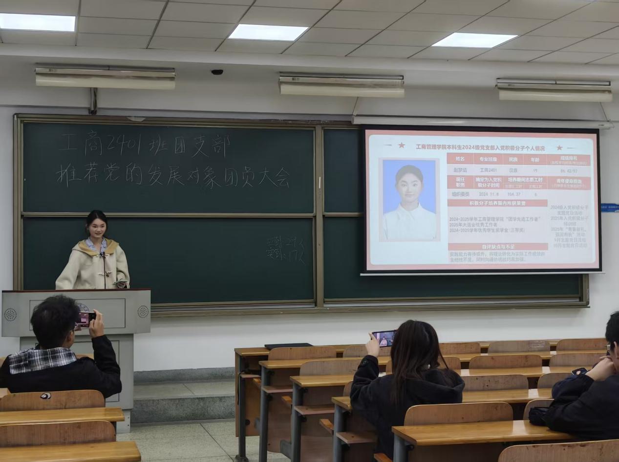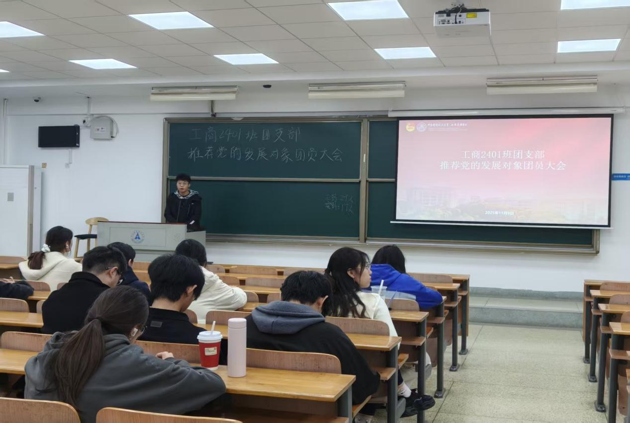 【通讯员 许玉彬】为严格落实党员发展工作要求,扎实推进共青团推优入党工作,切实把政治素质好、综合素质优的优秀团员推荐到党组织中来,2025年11月下旬,工商2401团支部在文泰楼403教室隆重召开党的发展对象推荐大会。本次大会严格遵循《中南财经政法大学共青团推优入党工作实施细则》相关规定展开,工商2401团支部全体团员准时参会。