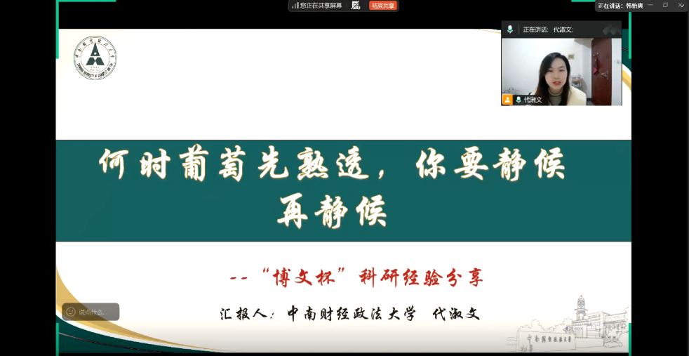 工商管理学院张珺如重返中南财经政法大学的线上平台,为同学们倾囊相授、指点迷津,以自身项目为例,生动阐释了如何将一个项目“吃透”并实现成果最大化。她分享了自己从一个创业项目中挖掘出多个值得研究的学术问题,并成功申报各类竞赛的实战经验,强调,“这种基于创业项目提出的实证研究,其结论又能反哺和完善最初的创业项目,形成一个相辅相成、互相助力的良性循环。”这不仅拓展了学生们的项目选题与研究思路,而且还加深了对核心问题的剖析。