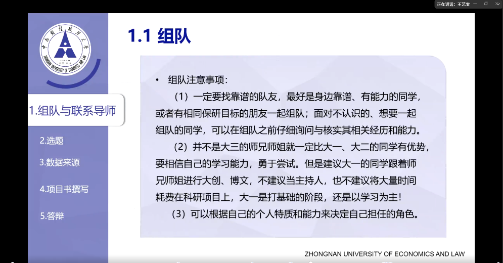 会计学院王艺霏同学从组队与联系导师、选题、数据来源、项目书撰写、答辩全过程带领同学们学习如何打比赛,并就项目研究的基础——数据与文献,进行了细致梳理。她分享了学术科研数据库,政府与第三方公开数据平台,为同学们指明数据查找的方向。在文献综述部分,她指出“综”是梳理现有研究,“述”是进行评述并找出当前不足,从而引出自己的研究问题,这是确立项目创新性的关键。