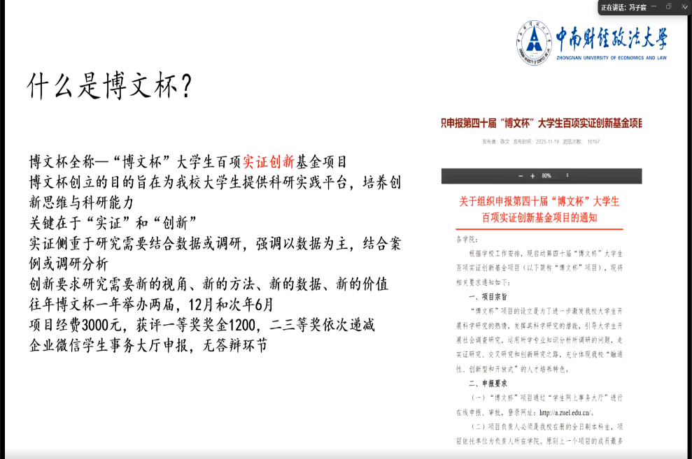 (通讯员 祁梦婷)跨学院聚力启征程,携文思助力传薪火。为了增进工商管理学院与会计学院学子对于博文杯,大创赛的了解,11月29日下午4时,由会计学院与工商管理学院联合主办的“博采文思·创赢未来”2025博文大创联合分享会在线上成功举行。本次分享会由工商管理学院科研部部长韩怡爽主持,特邀张珺如、冯子宸、代淑文、王艺霏,四位经验丰富的优秀学子进行分享,凭借着强大的嘉宾阵容与实在的“干货”内容,吸引了全校超过380名同学云端相聚,反响热烈,互动频频。
