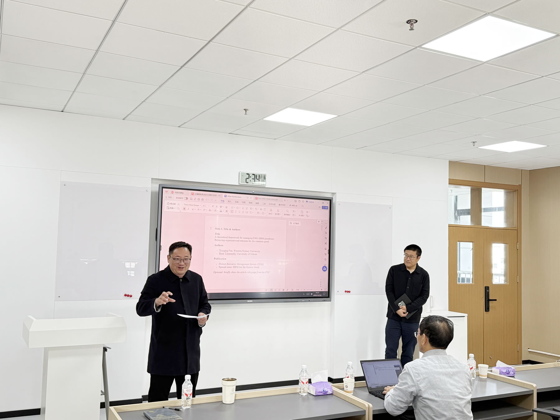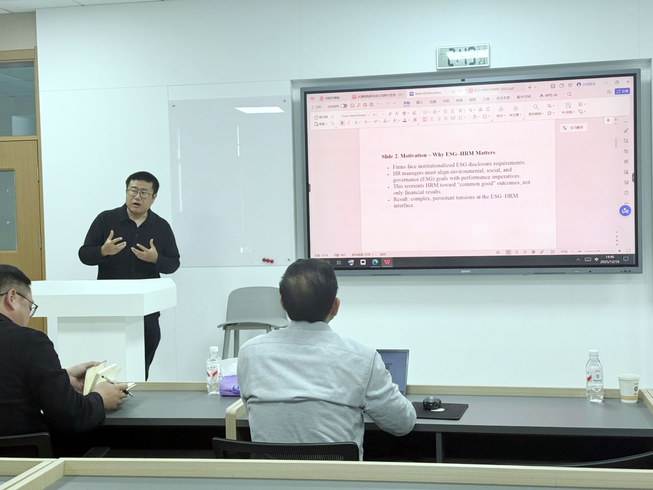 会议伊始,刘文兴教授对范酉庆博士的到访表示了热烈欢迎,并简要介绍了其在人力资源管理与ESG领域的学术积淀及行业影响力。范博士随后分享了题为《ESG情境下HRM悖论管理的理论框架:在组织张力中平衡社会共同福祉》的最新研究成果。