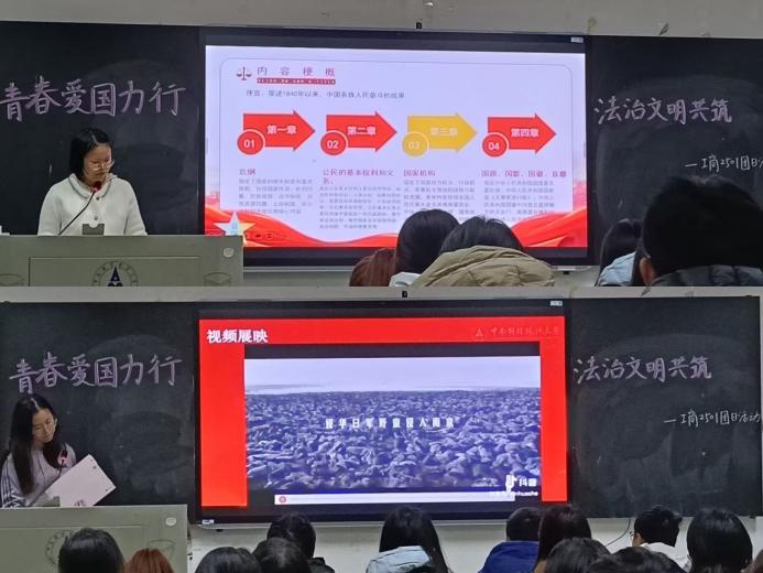 活动第二项,开启“法治筑魂,爱国固本”素养培育环节。左梦园同学先后介绍了宪法起源、发展、地位和原则,以互动的方式普及宪法知识,让大家深入学习宪法作为“国家基本法”“根本活动准则”的核心内容,将坚持宪法的观念根植团员心中。随后,胡杉同学以展映特色视频的形式带领大家了解国家公祭日背后的南京大屠杀历史。昭昭前事,惕惕后人,同学们在观看短片的过程中回温历史,铭记国殇。