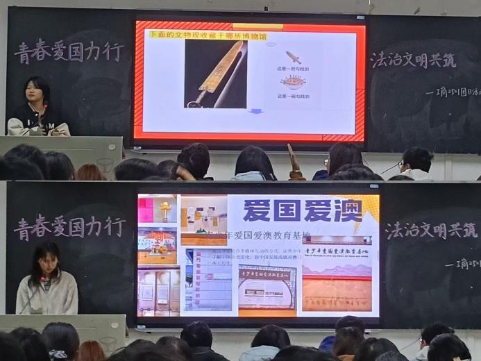 活动第三项,推进“文脉传承,自信聚力”环节。张奕馨同学组织全体团员参与知识竞答,深化大家对“中华缠枝纹薄胎玉壶”“春秋越王勾践剑”等文物的认识。同学们在抢答中增进对中国历史文物的全面认知与具体把握,坚定文化自信,趣中传文脉,嬉里续薪火。随后,曾日楹同学给同学们带来澳门的生活经历。在这位澳门本地人的亲口讲述下,团员们得以领略澳门回归后日新月异的发展气象,深化对国家统一的认识,激发民族自豪感。
