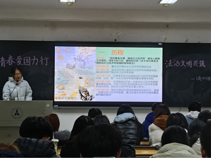 活动第四项,转入“绿色赋能,青年先行”海报分享环节。黄梦玲同学以“碧水证我实践志,青春咏怀爱国心”为主题,围绕长江生态建设,在系统解读海报元素中揭示长江保护的突出问题、积极进展和工作力度,呼吁大家学习长江保护的“三大关系”。团员们在沉浸式学习中,明晰长江生态保护重要性,进一步强化了青年一代践行生态责任、助力生态文明建设的行动自觉。