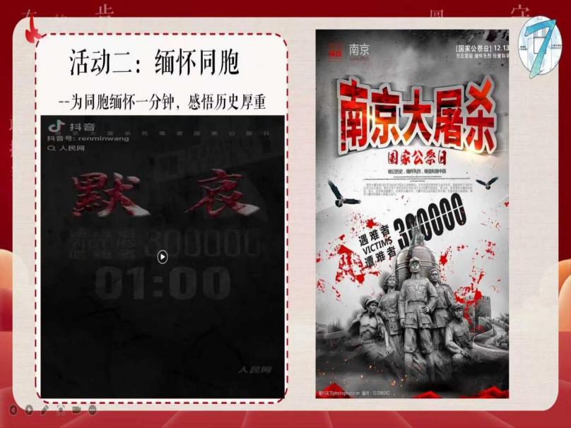 在“缅怀同胞”环节,全体成员为南京大屠杀遇难同胞默哀一分钟。现场一片肃穆,成员们低头垂目,在静默中追思那段血泪交织的历史。大屏幕上“300000”的遇难者数字格外醒目,时刻提醒着大家:这不是冰冷的数字,而是一个个逝去的生命、一段段破碎的家庭。默哀结束后,不少成员眼含热泪,深刻体会到历史的沉重与和平的珍贵。