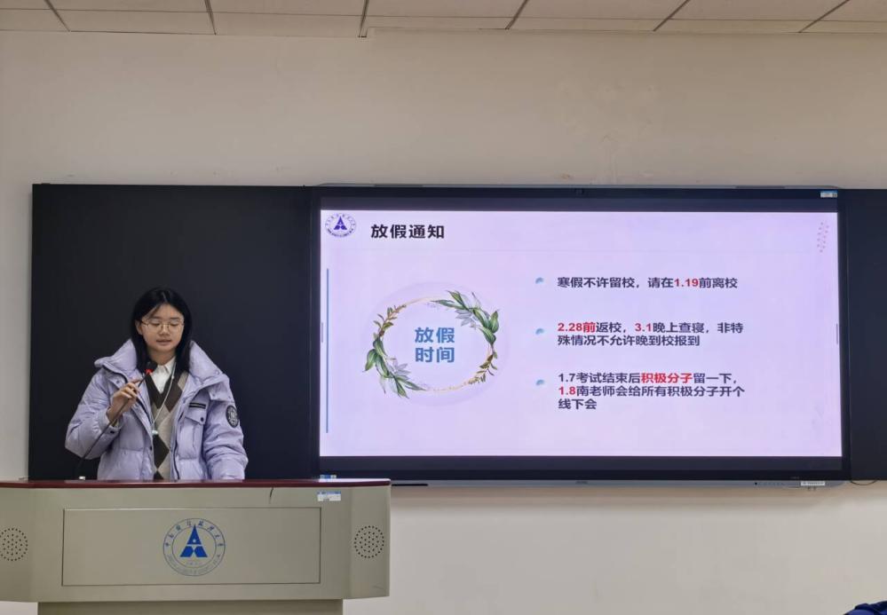 活动第二项,发布“放假通知”关键事宜。班长杨茜同学为大家明确寒假离校与返校时间,非特殊情况不得逾期返校。同时,针对班级积极分子的线下会议进行特别通知。