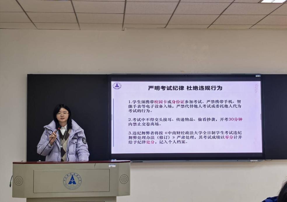活动第一项,聚焦“诚信考试”核心主题。班长杨茜同学为同学们详细解读《中南财经政法大学全日制学生考试违纪舞弊处理办法(修订)》,明确考试纪律,提醒同学们入场须携带校园卡或身份证,严禁电子设备入场及代考等违规行为,考试中不得交头接耳、抄袭传递,违纪舞弊将面临零分处理与纪律处分,相关记录存入个人档案。随后,针对微积分、英语等重点科目,班长特别提醒同学们需认真备考,严肃对待每一场考试,以真实实力书写学业答卷。