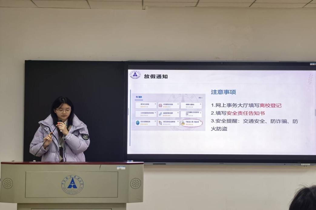 活动最后,提醒假期安全注意事项。班长为大家逐一强调离校前必备流程:完成网上事务大厅离校登记、签署安全责任告知书。此外,围绕交通安全、防诈骗常识、防火防盗注意事项等进行详细讲解,提醒同学们提高安全警惕,牢记防护要点,让假期在平安护航下更加舒心安心。