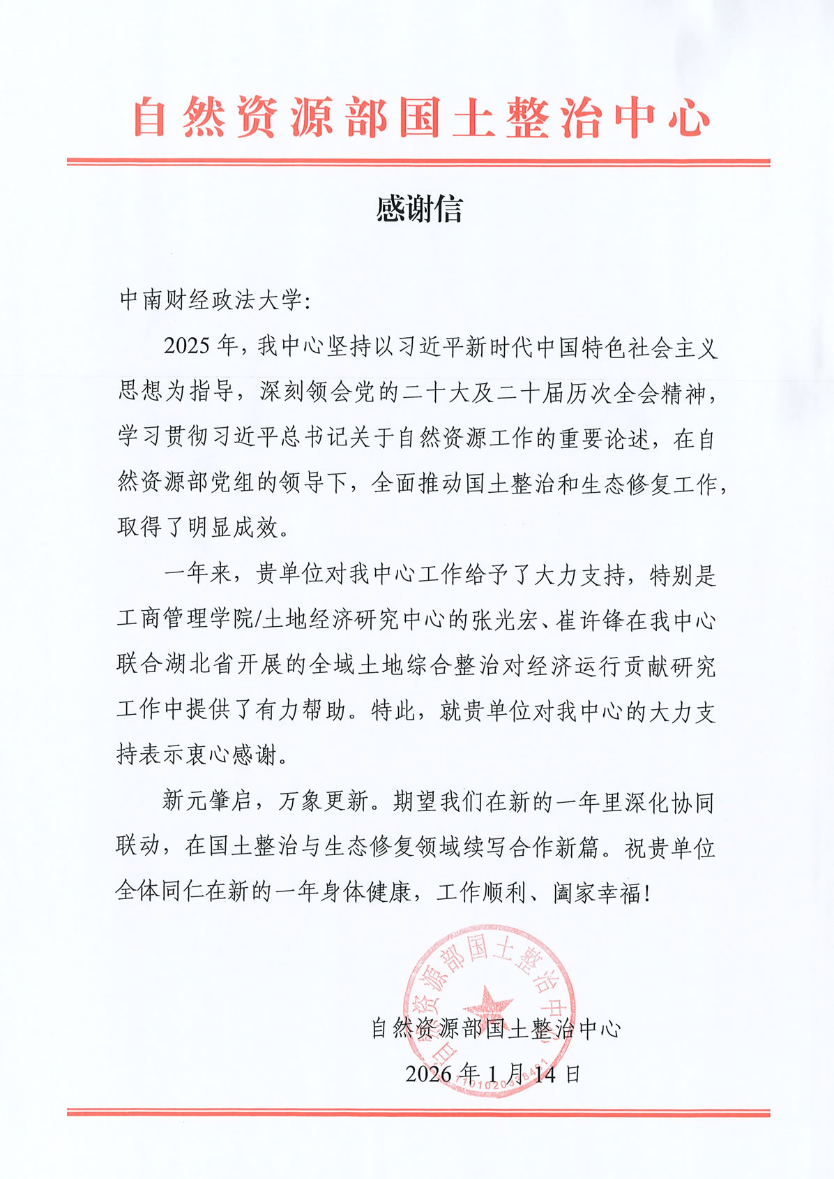 近日,我校收到自然资源部国土整治中心发来的感谢信。信中对我校在2025年国土整治和生态修复工作中给予的大力支持表示衷心感谢,特别肯定了工商管理学院/土地经济研究中心张光宏、崔许锋两位专家在“全域土地综合整治对经济运行贡献研究”中作出的重要贡献,并期待与我校在新的一年里深化协同联动,续写合作新篇。