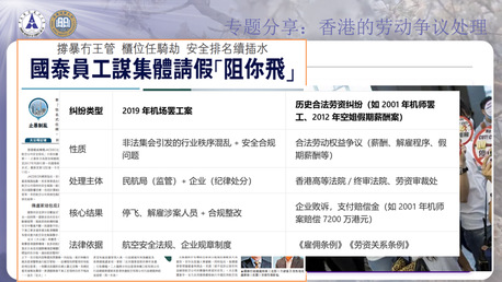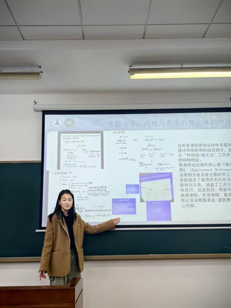 随后,阳汶珊同学围绕“内地与香港的劳动体制对比”这一专题进行了重点分享。她从立法渊源、核心法律、争议解决机制及工会角色四个维度展开分析。她指出,香港属于普通法系,核心为《雇佣条例》,立法哲学偏向“自由契约”,强调程序正义;而内地则属于大陆法系,以《中华人民共和国劳动合同法》为核心,强调对劳动者的倾斜保护。争议解决机制上,香港以劳工处调停、劳资审裁处审理为核心,程序高效且不允许律师介入;内地实行“调解—仲裁—诉讼”三级处理机制,仲裁为诉讼前置程序,行政与司法协同发力。