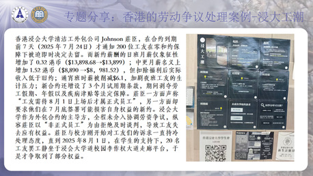阳汶珊同学还结合国泰航空解雇机师案、海皇粥店欠薪案、浸大清洁工外包争议等典型真实案例,生动展示了香港劳动争议处理中“调解前置”“机构多元”“执行有力”等特点,并对跨境用工的法律适用难题提出了自己的思考。同时,她还对粤港澳跨境用工典型案例进行分析,指出当前跨境劳动争议存在法律适用冲突、用工基准差异、文书跨区执行难等问题,并结合广东高院裁判规则,提出“实质重于形式”的劳动关系认定思路。