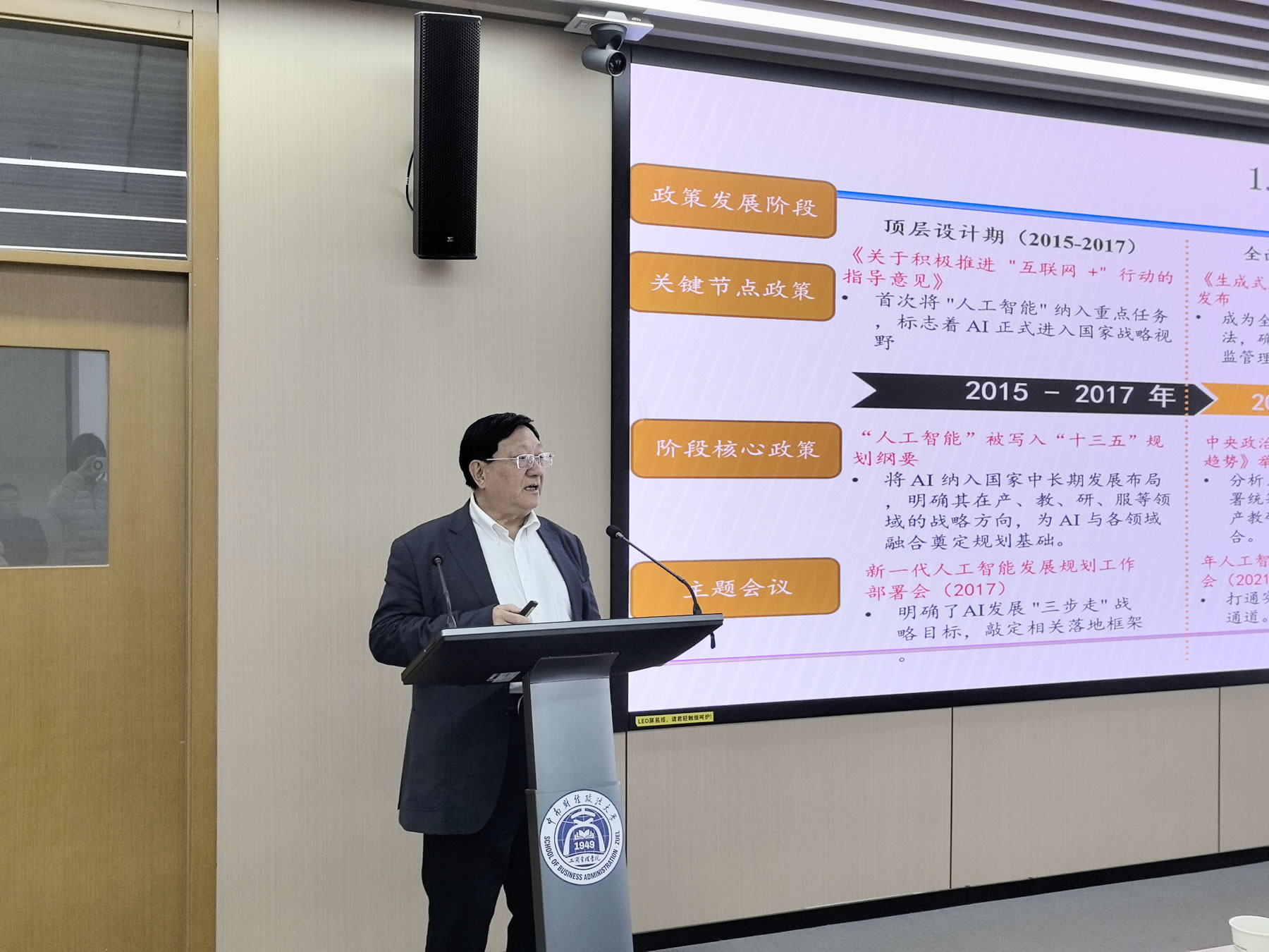 在讲座过程中,赵曙明教授还结合当前全球人工智能领域的发展趋势,深入分析了各国在人工智能领域的发展基础、竞争态势及其战略意义。随后,基于理论分析与前沿观察,他进一步梳理了国家在不同阶段对人工智能发展的政策支持,以及人工智能背景下工商管理学科面临的新机遇与新使命。围绕如何以AI赋能产教研服深度融合,赵曙明教授提出了四个方面的对策建议:一是教师应加快构建“AI+教育”能力升级体系;二是企业家应着力打造“人才—技术”双向赋能生态;三是人力资源从业者应加快建设“智能服务”中枢平台;四是推动教育、产业、服务三方协同,构建贯通融合的闭环体系,以技术创新破解“产教断层”这一核心痛点。