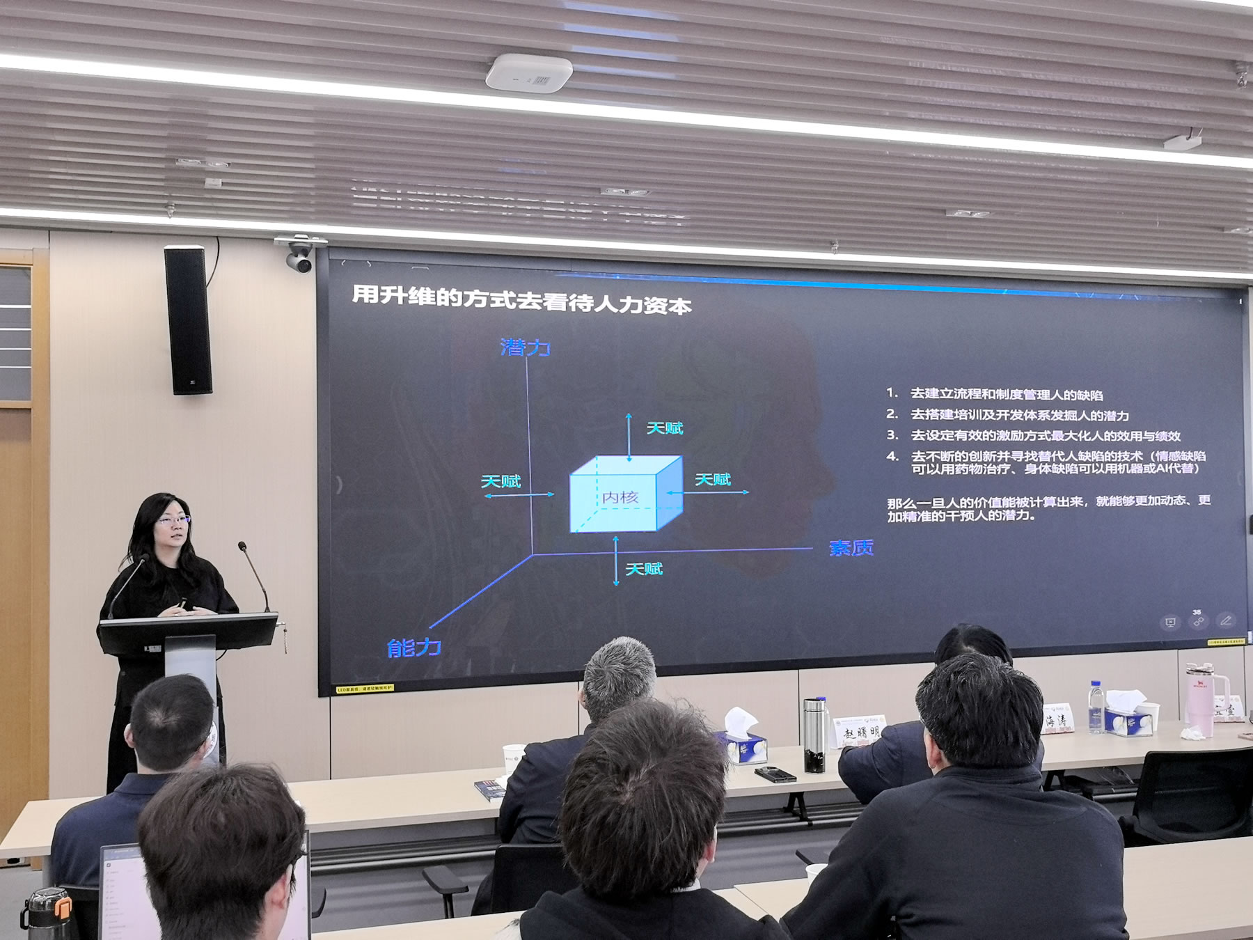 在第二场讲座中,南京大学商学院的赵宜萱副教授以“数智时代HRM破局与持续发展”为主题,围绕AI对人力资源管理发展与创新的影响、人力资源管理数智化转型的路径与对策,以及数智时代HRM的未来趋势等内容进行了深入讲解。赵宜萱副教授认为,企业的持续增长离不开商业模式、管理方法和技术范式这三大要素的协同作用,AI-HRM的核心特征在于动态性、平衡性和整合性,人力资源管理应顺应数智时代的发展要求,加快从单一模块优化向系统协同治理转变,持续提升组织管理的适应能力和创新能力。此外,赵宜萱副教授还从研究初衷、人才成长与组织发展等角度分享了自己的思考。她强调,面对员工状态变化,管理者应更加注重积极引导和有效推动,通过制度设计与组织支持激发个体潜能,进而实现员工成长与组织发展的双向促进