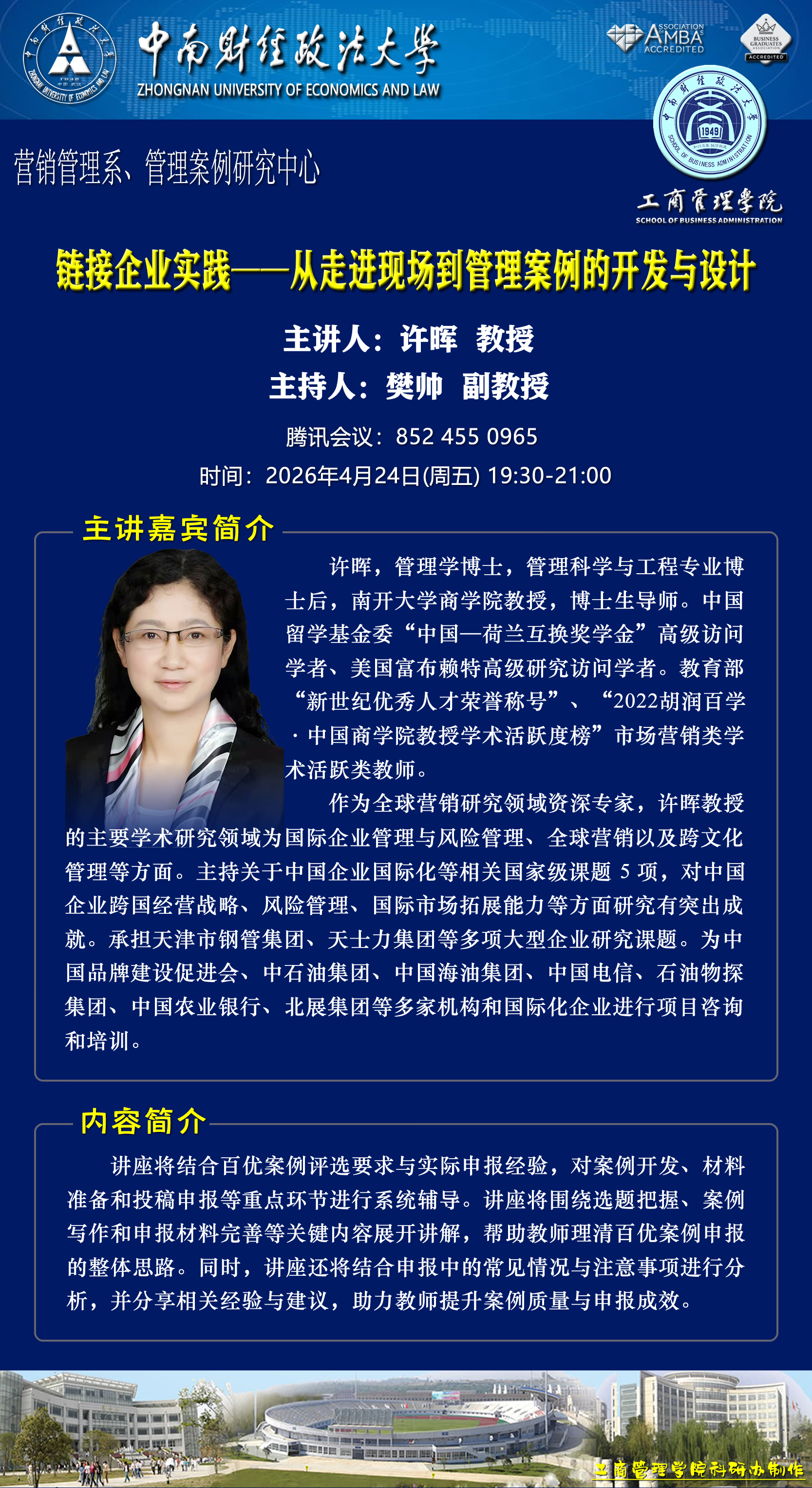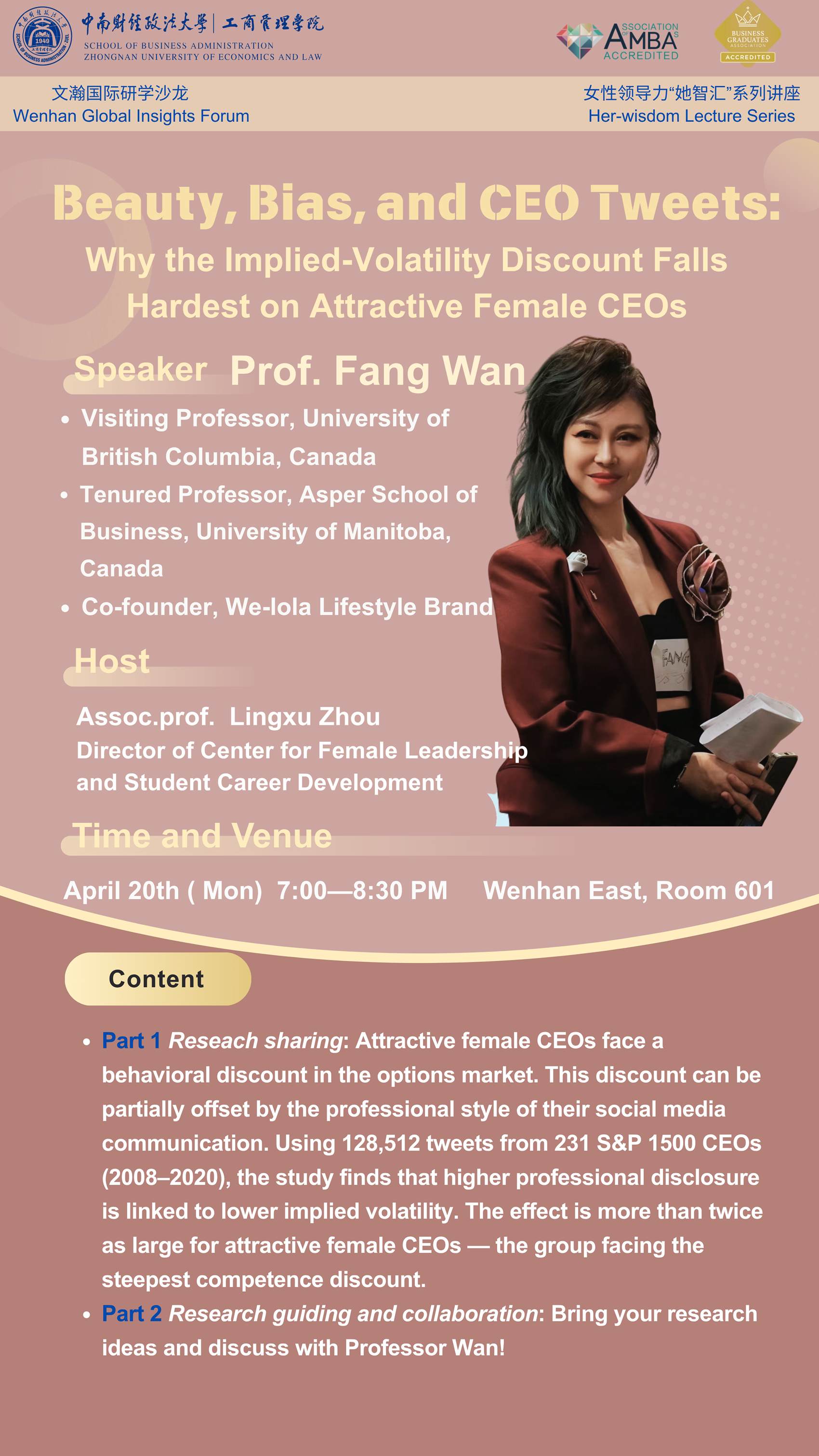 时间地点主办单位主持人主讲人主题2026.04.20 19:00-20:30文瀚楼东601女性领导力与大学生职业发展研究中心文瀚国际研学沙龙周凌旭 副教授万方 教授Beauty, Bias, and CEO Tweets:Why the Implied-Volatility Discount FallsHardest on Attractive Female CEOs2026.04.2210:00-12:00;14:00-15:30文瀚楼东601人力资源管理系、数字零工管理战略团队刘文兴 教授张昕 助理教授主题一:Dual effects of side-hustle customer gratitude expression on employees’ customer behaviors in full-time job主题二、论文选题以及发表经验交流2026.04.23 15:00-17:00文瀚楼北602工商管理系、市东西湖区人力资源服务协会赵君 教授梁苗 秘书长重塑自我:HR的跨界探索与成长之路2026.04.24 19:30-21:00腾讯会议:852 455 0965营销管理系、管理案例研究中心樊帅 副教授许晖 教授链接企业实践——从走进现场到管理案例的开发与设计