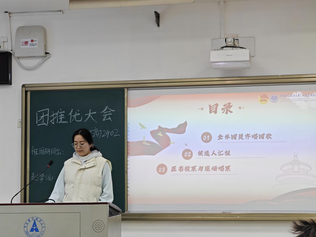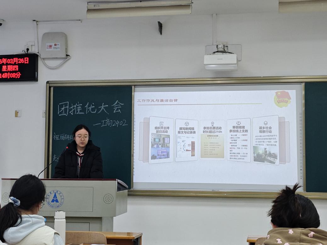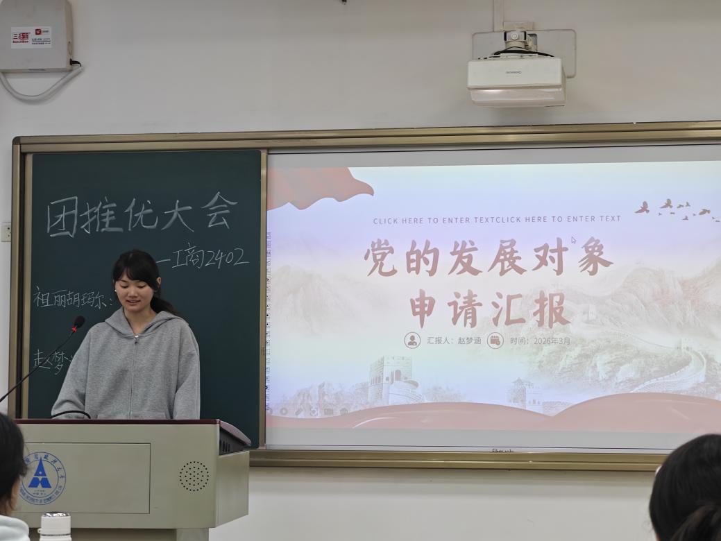 (通讯员 韩怡爽)2026年3月26日,工商2402团支部为切实选拔思想政治坚定、综合素质优秀的青年学生,有序开展入党积极分子推优大会与主题团日活动。本次大会由团支书马皎清主持,全体团员参与投票,非团员同学全程旁听,共同推进班级工作有序开展。