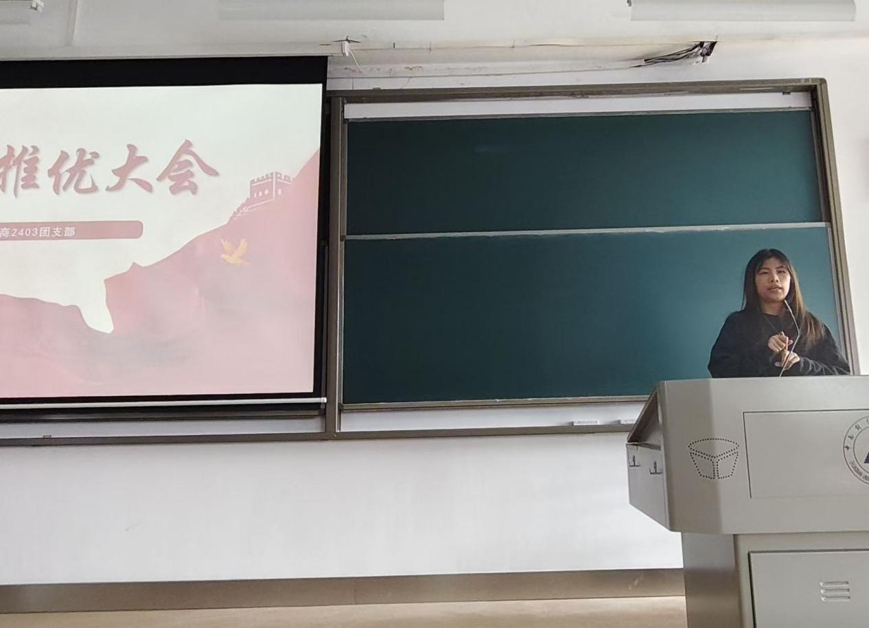 会议最后,团支书李静楠对本次团入党推优会议进行全面总结。她对胡梦蝶、吴怡娴两位同学顺利通过推优表示热烈祝贺,希望她们以此为新的起点,始终以党员标准严格要求自己,不断提升自身综合素质,以实际行动践行初心使命,争取早日加入中国共产党。同时,她勉励全体参会团员以优秀同学为榜样,坚定理想信念,加强理论学习,提升自身能力,积极向党组织靠拢,在学习和生活中发挥先锋模范作用,以青春之我、奋斗之我,为支部建设与团组织发展贡献青春力量。