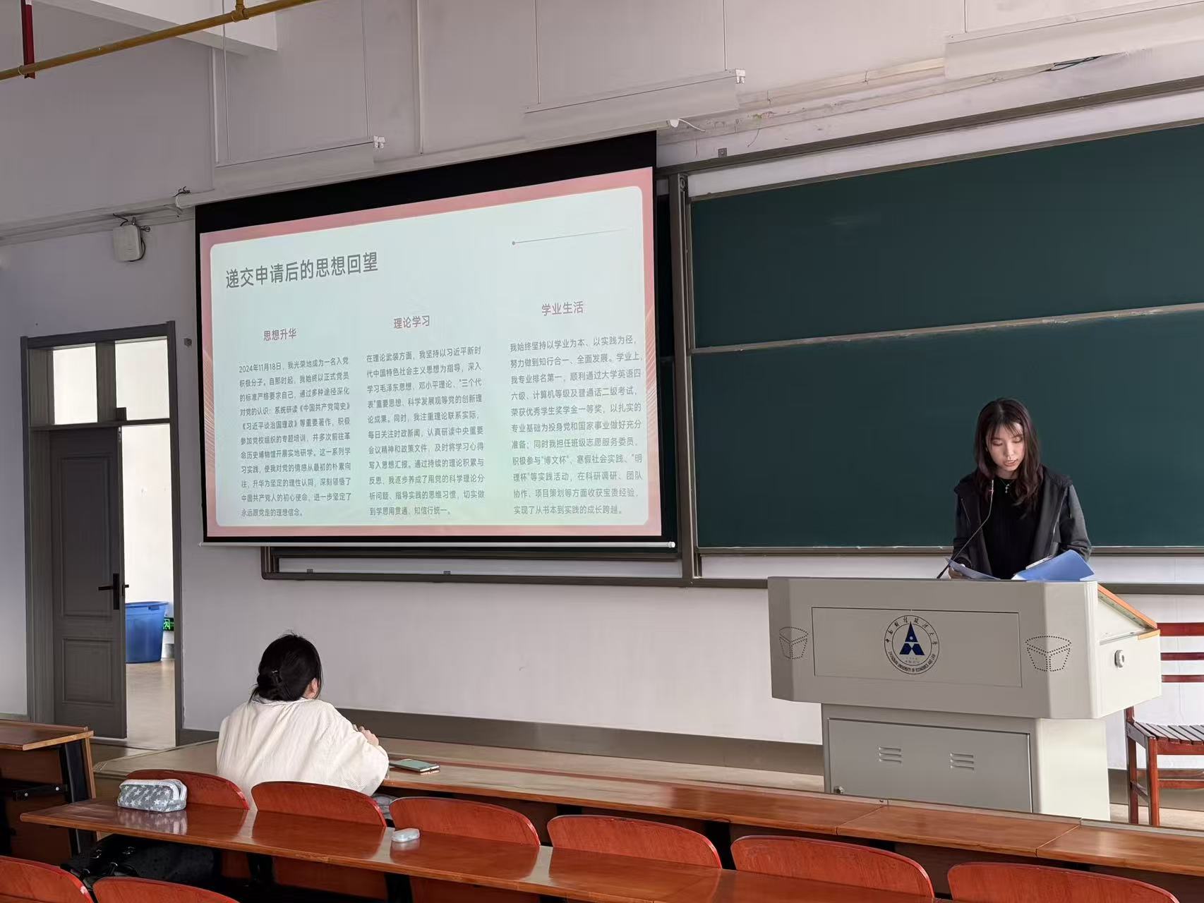 在候选人答辩环节,推优候选人胡梦蝶、吴怡娴依次上台进行个人陈述与现场答辩。两位候选人分别围绕自身思想觉悟、日常学习表现、团内工作担当、入党初心动机以及未来成长努力方向等多个方面,进行了全面且细致的阐述。她们结合自身学习、生活与团内工作实际,分享了在思想上积极学习党的理论知识、主动向党组织看齐的思想感悟,在学习中勤奋刻苦、锐意进取的端正态度,以及在团内工作中认真负责、热心服务同学的实践经历,充分展现了新时代团员青年坚定的理想信念、良好的精神风貌与扎实的综合素养,赢得了参会团员的一致认可。