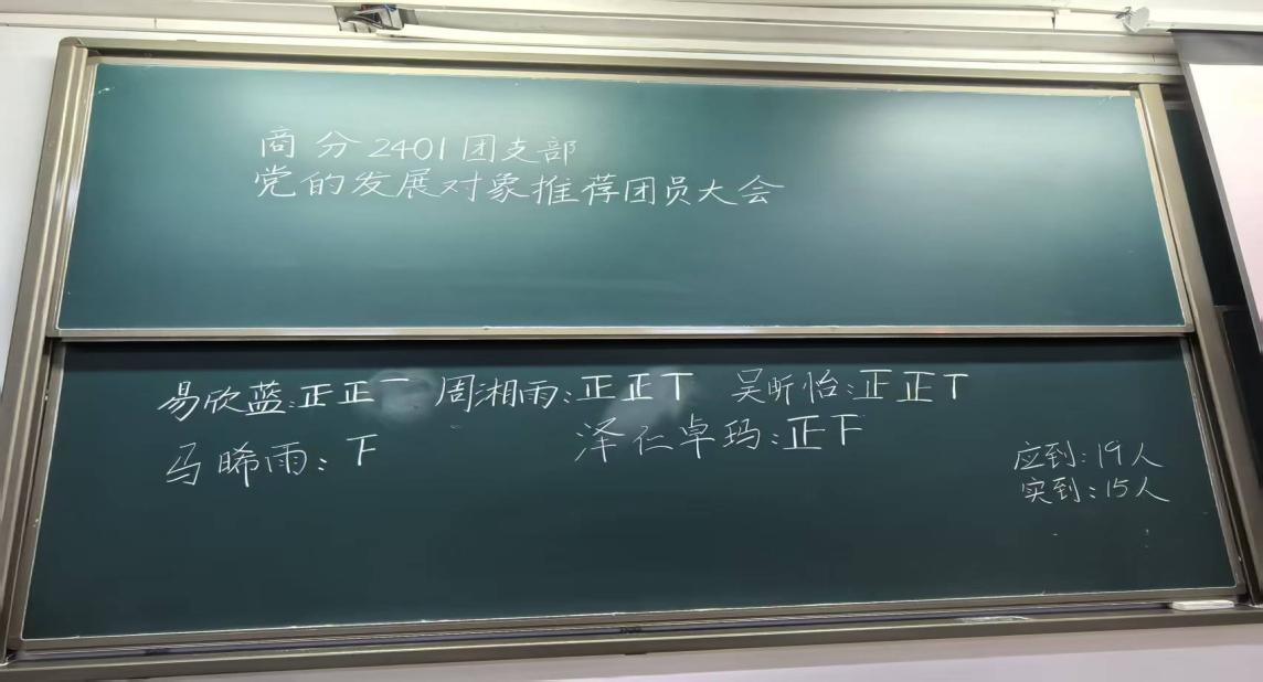 此次推优入党大会不仅是团支部落实“党建带团建”机制的重要实践,也为优秀团员提供了展示与成长的平台。通过规范严谨的程序,大会进一步激发了团员青年的政治热情,增强了团支部的凝聚力与向心力。商分2401团支部将持续做好团员教育引导工作,鼓励更多青年学子追求进步、担当奉献,为党和国家事业发展贡献青春力量。