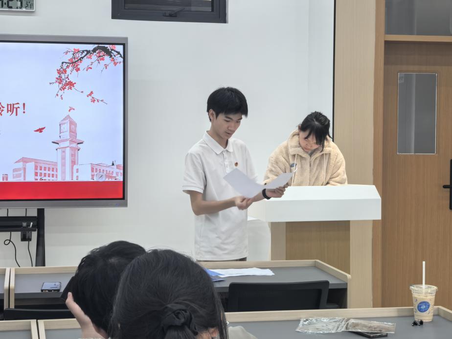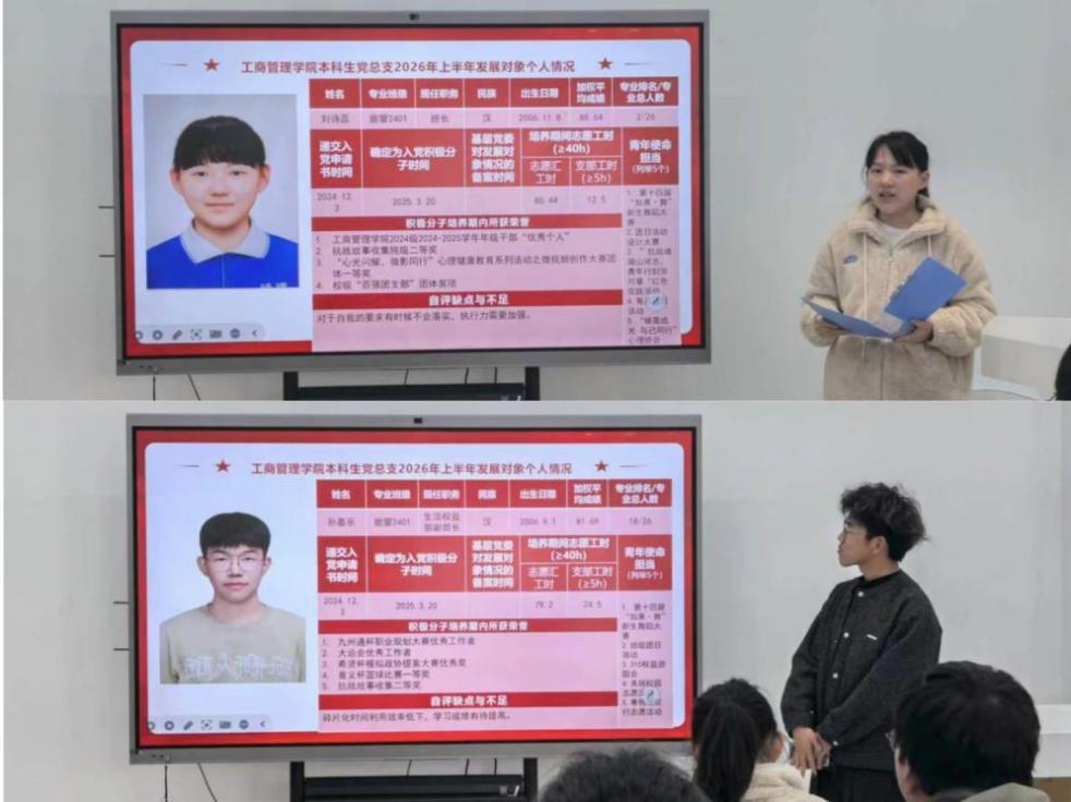 随后,答辩人刘诗蕊、孙嘉乐依次进行个人陈述。两位同学围绕个人基本情况、思想政治表现、学习工作情况、志愿服务经历及今后努力方向等方面进行了全面汇报,展现了积极向上的精神风貌、扎实认真的学习态度和较强的责任意识,也表达了向党组织靠拢的坚定决心。
