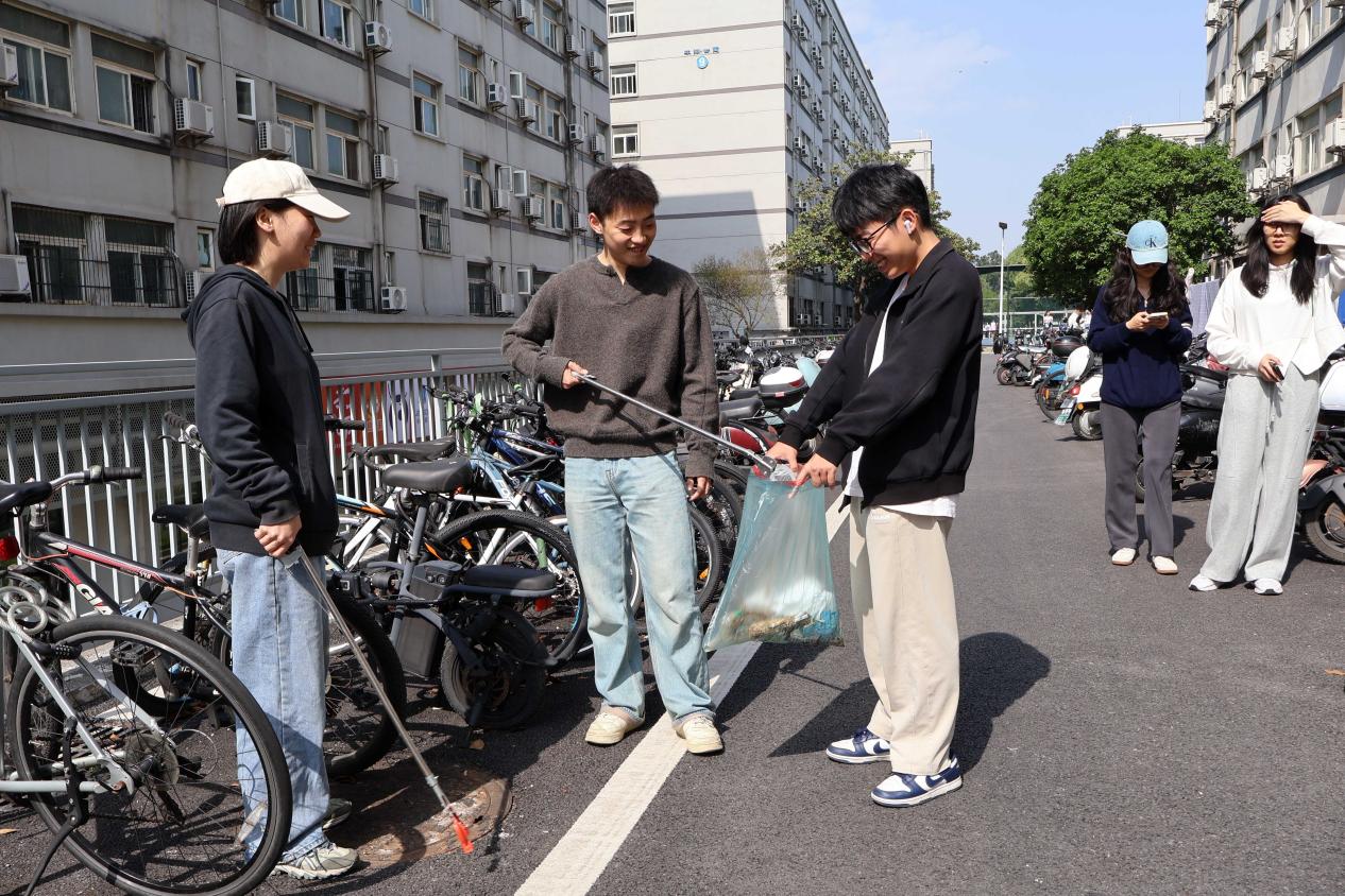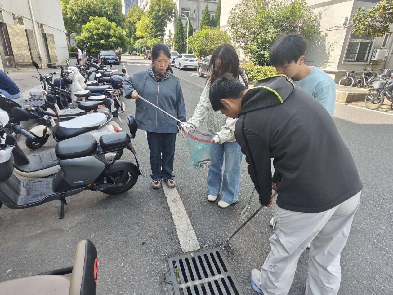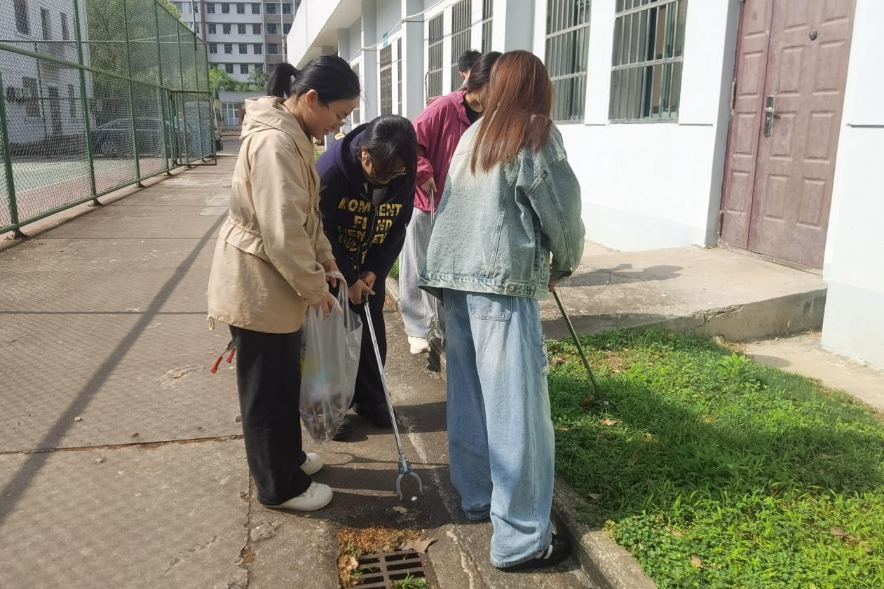 活动现场,志愿者们分工明确、协作高效,手持垃圾夹、垃圾袋等工具,对路面散落的垃圾、绿化带中的白色污染物、烟头碎屑,以及墙角缝隙里的顽固杂物开展“地毯式”清理。大家弯腰俯身、细致排查,忙碌的身影穿梭在校园的林荫道与绿化带之间,用实际行动守护校园环境的整洁。