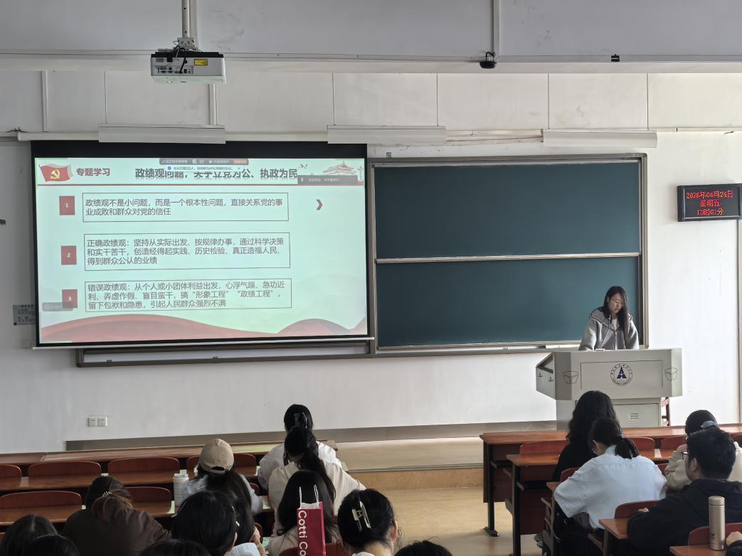在专题学习环节,范静怡同学围绕《习近平关于树立和践行正确政绩观论述摘编》开展领学。她从政绩观的根本性意义、正确政绩观与错误政绩观的鲜明对比、正确政绩观核心要求等方面系统讲解,引导党员坚决抵制“形象工程”“政绩工程”,纠治急功近利、弄虚作假等错误倾向,始终坚持从实际出发、为人民谋福祉。