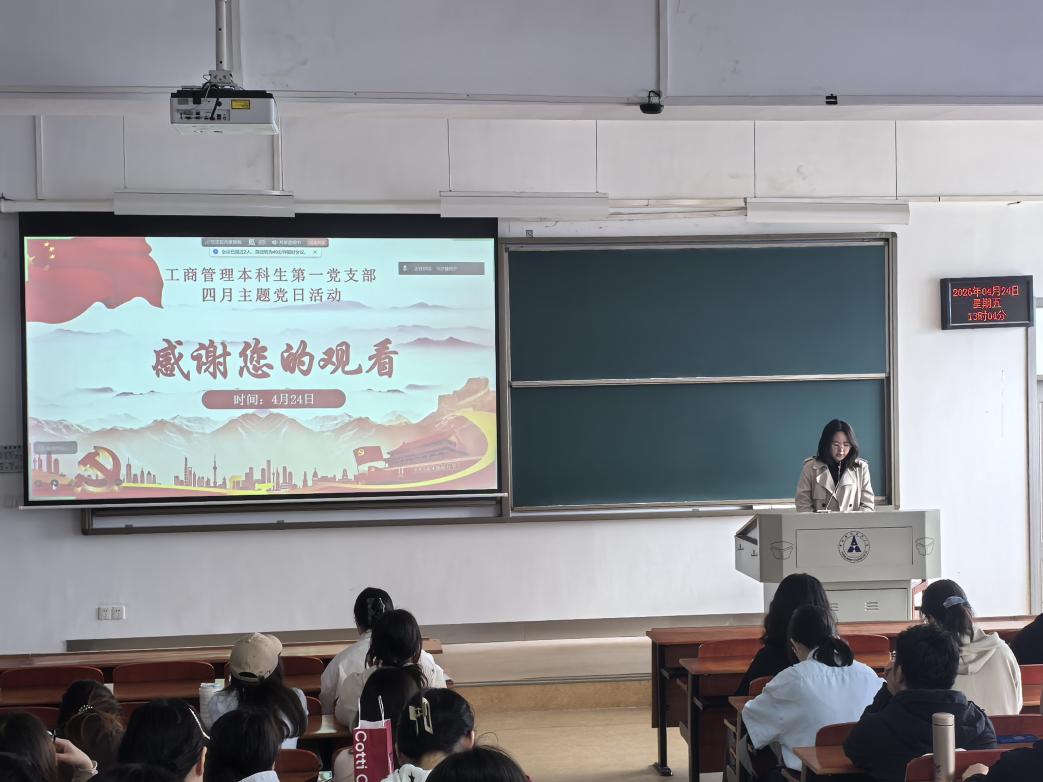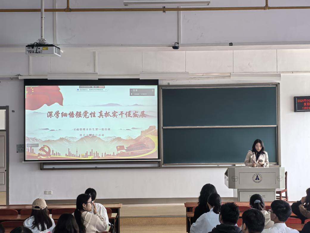 (通讯员:李亭逸)为深入学习贯彻习近平总书记重要讲话精神和重要指示精神,持续强化理论武装、凝聚奋进共识,引导支部党员筑牢信仰之基,工商管理本科生第一党支部于2026年4月24日在南附302教室召开以“深学细悟强党性,真抓实干促发展”为主题的四月主题党日活动。会议由任皓月同学主持,党支部全体党员、预备党员参与。