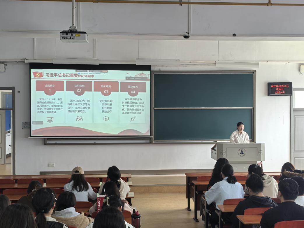 胡梦蝶同学针对习近平总书记重要指示精神中的全国服务业大会精神进行领学,传达习近平总书记重要指示,梳理服务业发展成就、指导思想、核心原则与重点任务,引导党员关注现代服务业发展趋势,立足专业找准奋斗方向。