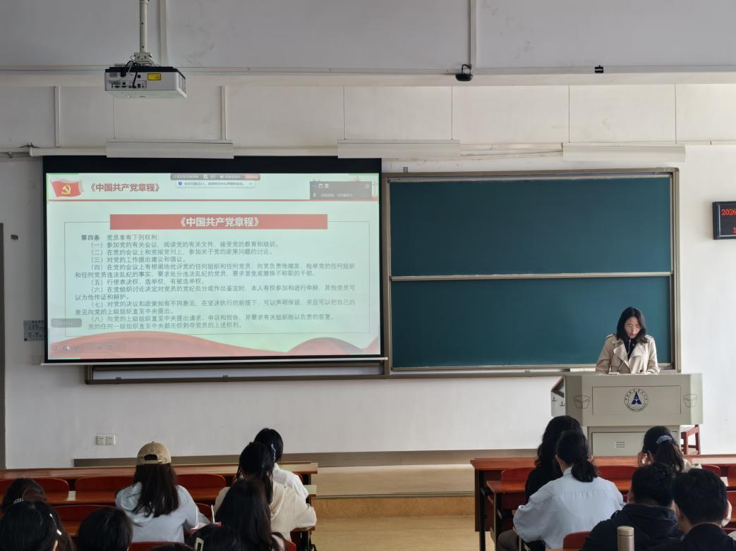 随后由任皓月同学领学《中国共产党章程》。她带领全体党员重点学习党章中党员权利、发展党员流程、预备党员入党誓词等核心内容,逐条解读条款内涵,引导党员牢记党员身份、恪守党员义务、正确行使权利。