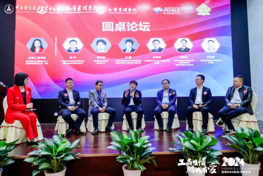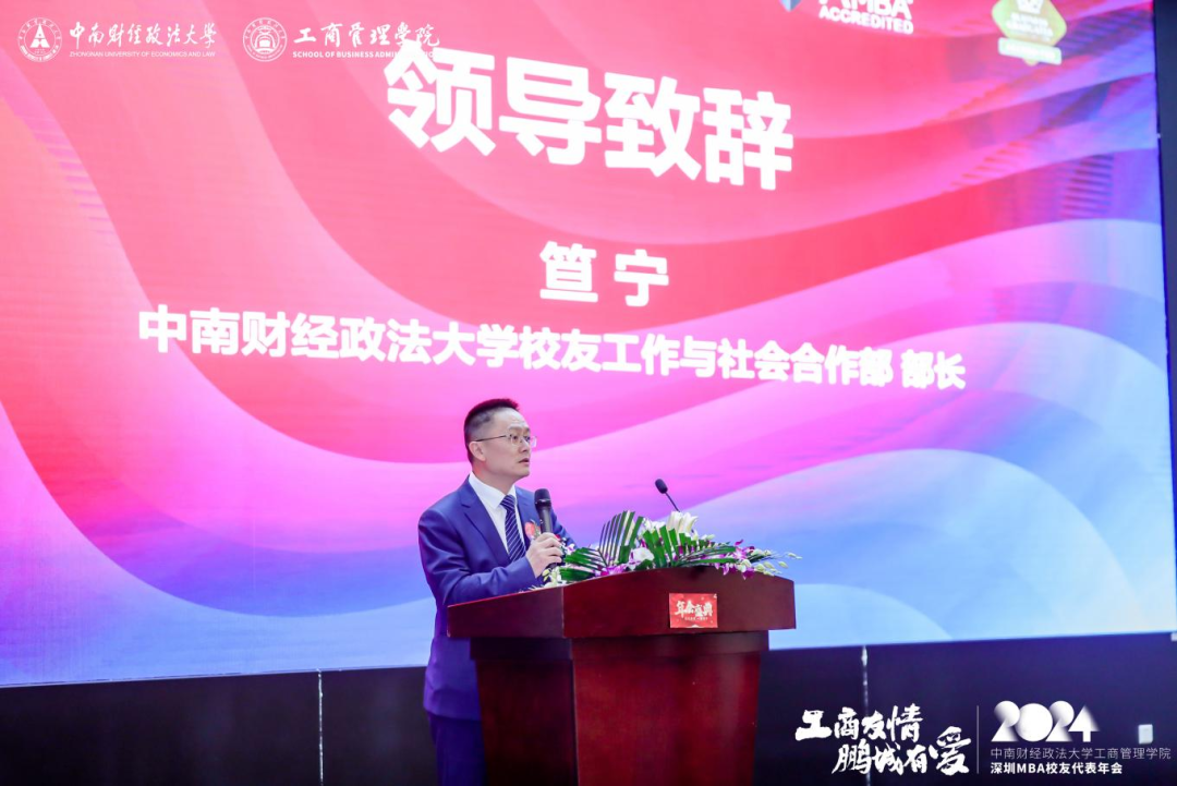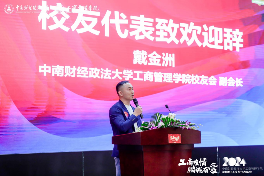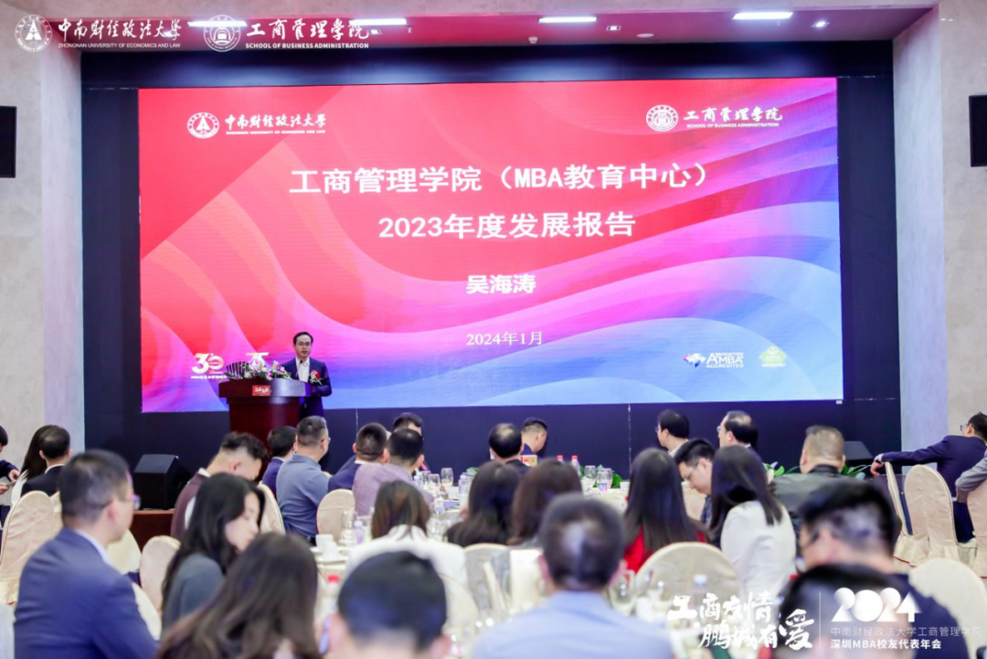 Da Ning, Director of Alumni Work and Social Cooperation Department of Zhongnan University of Economics and Law (ZUEL), Professor Wu Haitao, Dean of SBA and Director of MBA Education Center, Yu Xiaopeng, Secretary of SBA, Professor Wang Haisu, former founding Dean of MBA School, Professor Wen Hao, Vice Dean of SBA and Deputy Director of MBA Education Center, Professor Shi Junwei, Vice Dean of the SBA, Professor Du Peng, Academic Director of MBA Education Center, Secretary General of Shenzhen Alumni Association Chen Xuming, Zeng Zirong, Office Director of SBA, and Ms. Wang Yanming, Alumni Work Supervisor of MBA Education Center, attended the annual meeting, which was attended by more than 180 alumni representatives of Shenzhen MBA/EMBA from class 2002 to class 2023.