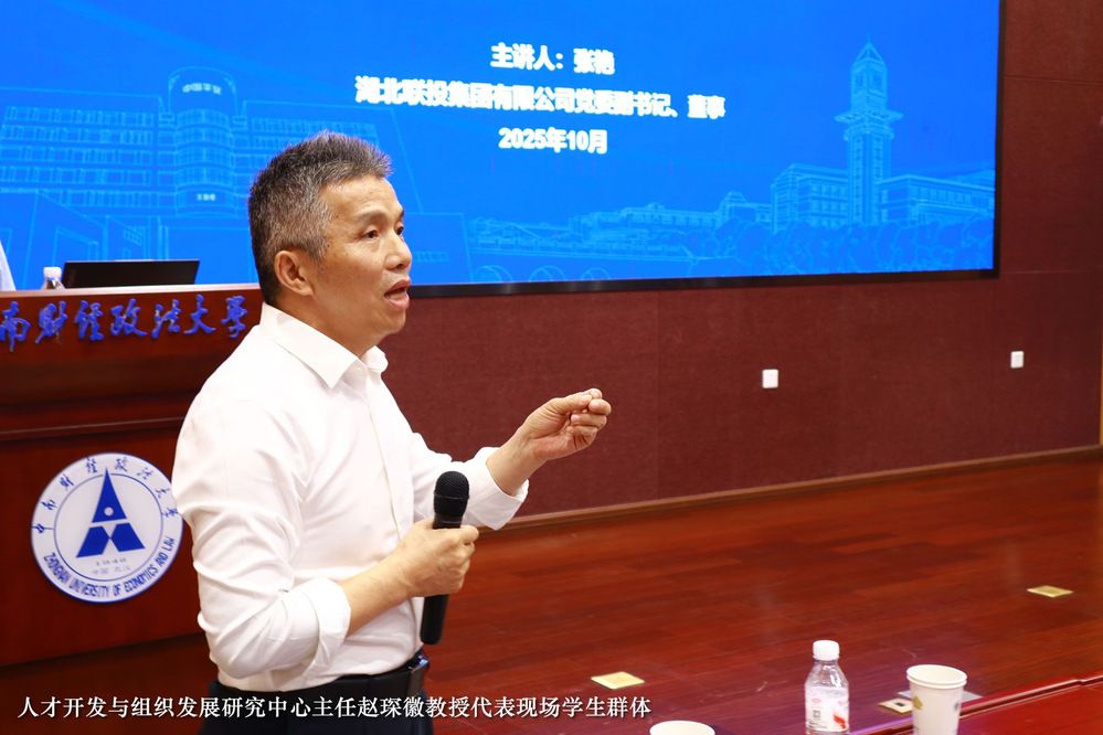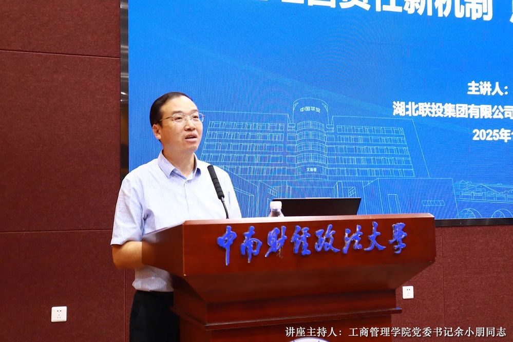 To explore State-Owned Enterprise (SOE) reform and operational mechanism innovation, and promote industry-university-research integration, a thematic lecture was held at the North Lecture Hall of Wenhan Building at 7:00 p.m. on 11th October 2025. Zhang Yan, Deputy Secretary of the Party Committee and Director of Hubei United Investment Group Co., Ltd., gave the lecture. Co-hosted by the School of Business Administration (SBA) and Hubei State-owned Assets and SOE Reform and Development Research Center, it was co-organized by the Talent Development and Organizational Development Research Center and the Department of Human Resource Management of Zhongnan University of Economics and Law (ZUEL). Yu Xiaopeng, Secretary of the Party Committee of SBA, presided over the event, which attracted over 280 teachers, students and business representatives.