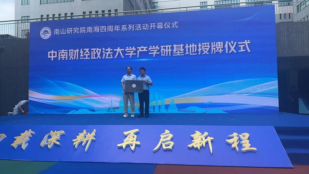On 19th October, the Guangdong Nanshan Institute of Pharmaceutical Innovation held the “Nanshan Institute Nanhai 4th Anniversary Series Event” in Foshan. Fu Hongqiao, Director of the Alumni Affairs and Social Cooperation Office of the School of Business Administration (SBA) at Zhongnan University of Economics and Law (ZUEL), attended the event and presented the plaque of the “ZUEL Industry-University-Research Base” to the institute. The plaque was received by Xia Kai, Deputy Director of the Institute and Vice President of the ZUEL Foshan Alumni Association.