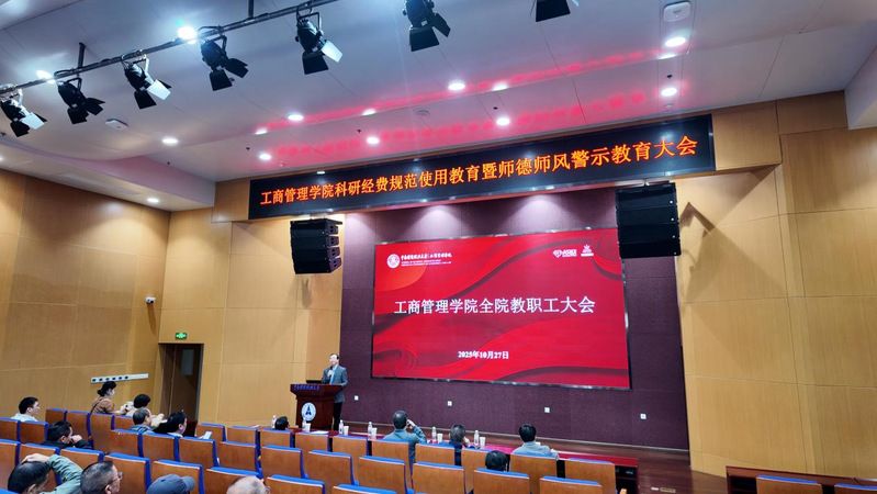 To strengthen faculty ethics and standardize research fund management, the School of Business Administration (SBA), Zhongnan University of Economics and Law (ZUEL), held a Special Training on Research Fund Management and Faculty Ethics Warning Conference on 27th October, 2025. The meeting was chaired by Yu Xiaopeng, Party Secretary of SBA, and attended by the full school leadership team and all faculty and staff.