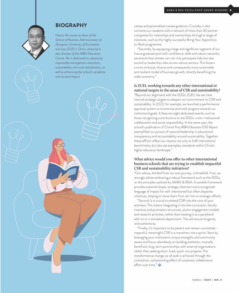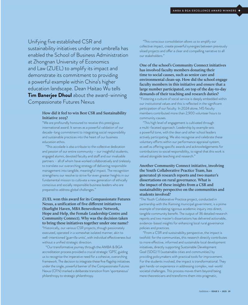 Recently, Professor Wu Haitao, Dean of the School of Business Administration and Director of the MBA Education Center of Zhongnan University of Economics and Law, was invited to an exclusive interview with AMBA Ambition, a leading journal in global business education. He shared the school’s innovative practices and strategic thinking in responsible management education in depth. Earlier, the school won the Gold Award of the 2025 AMBA&BGA Global Excellence in Business Education Awards for Best Corporate Social Responsibility and Sustainable Development Initiative with its Compassionate Futures Nexus. The dual recognition marks that Chinese universities’ cutting-edge exploration in responsible management education has gained world-class recognition.