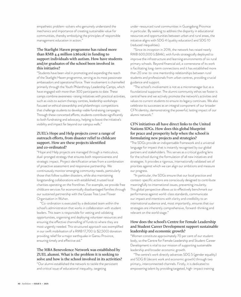 In the interview, Dean Wu Haitao revealed the school’s core framework of strategization, systematization and synergy honed over a decade. With the mission of creating new business knowledge, contributing business wisdom and cultivating business elites, the school integrated five iconic brand activities via the Compassionate Futures Nexus, building a multidimensional responsible education ecosystem covering care for special groups, educational equity support and female leadership empowerment. This framework embeds responsible management education into courses, research, faculty evaluation and ecological construction with alumni, enterprises and governments.