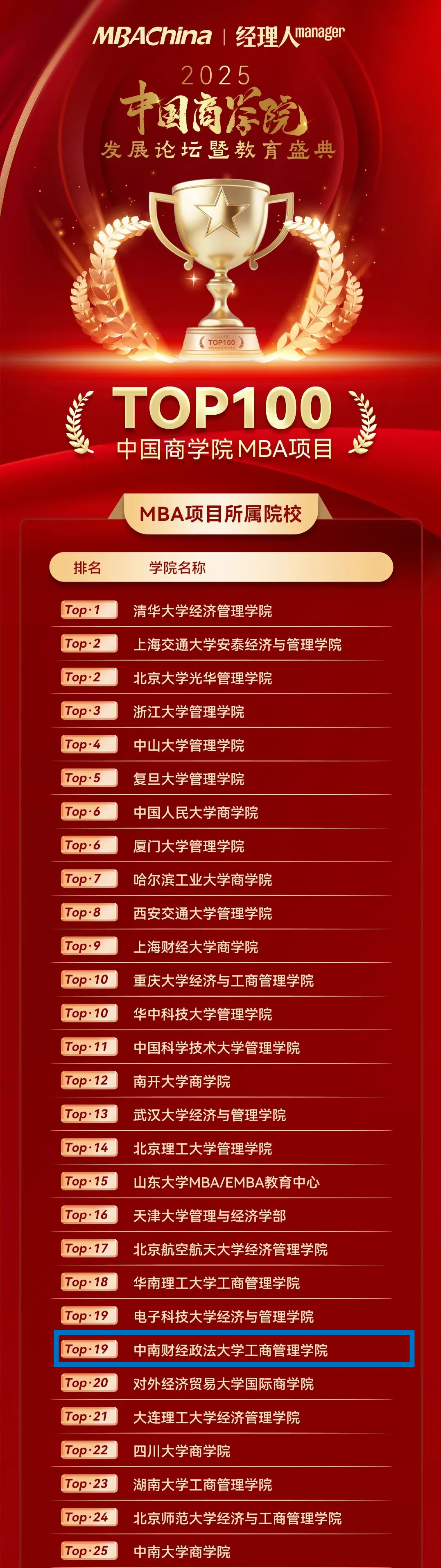The China Business School MBA Program TOP100 is one of the most authoritative and influential rankings in China’s MBA education field, widely recognized by all sectors of society for many years. It not only summarizes outstanding business schools annually but also integrates the spirit of integrity, innovation and excellence into the development of China’s business education.