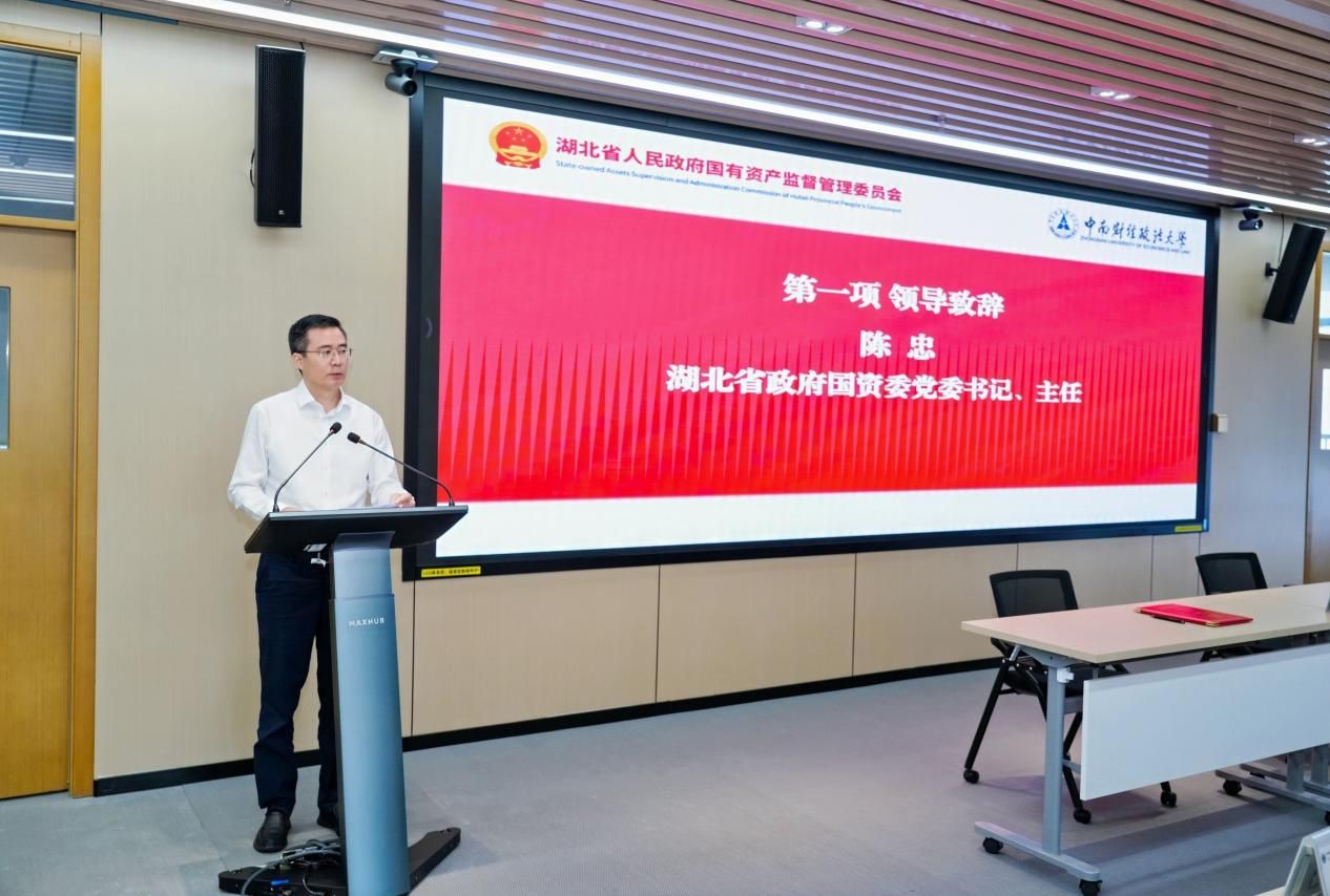 陈忠主任在致辞中首先对关心支持湖北国资国企改革发展的中南财经政法大学表示衷心感谢,对研究中心的成立表示热烈祝贺!他指出,省委、省政府高度重视国资国企改革发展工作,面对新形势、新使命、新任务,全省国资国企肩负着做强做优做大、更好发挥战略支撑和龙头引领的时代重任,迫切需要强大的智力支持和决策支撑。研究中心的成立是双方把握时代脉搏、应对复杂挑战、赢得发展先机的重要抉择和关键举措,必将为全省国资国企改革发展注入强劲动能。陈忠对研究中心未来发展提出三点希望:一要立足前沿,勇攀理论高峰;二要服务大局,当好智囊中枢;三要开放创新,提升品牌影响。省国资委将积极支持研究中心的建设与发展,期望研究中心以高质量研究成果服务科学决策,以高水平智力支撑赋能国资国企改革发展。
