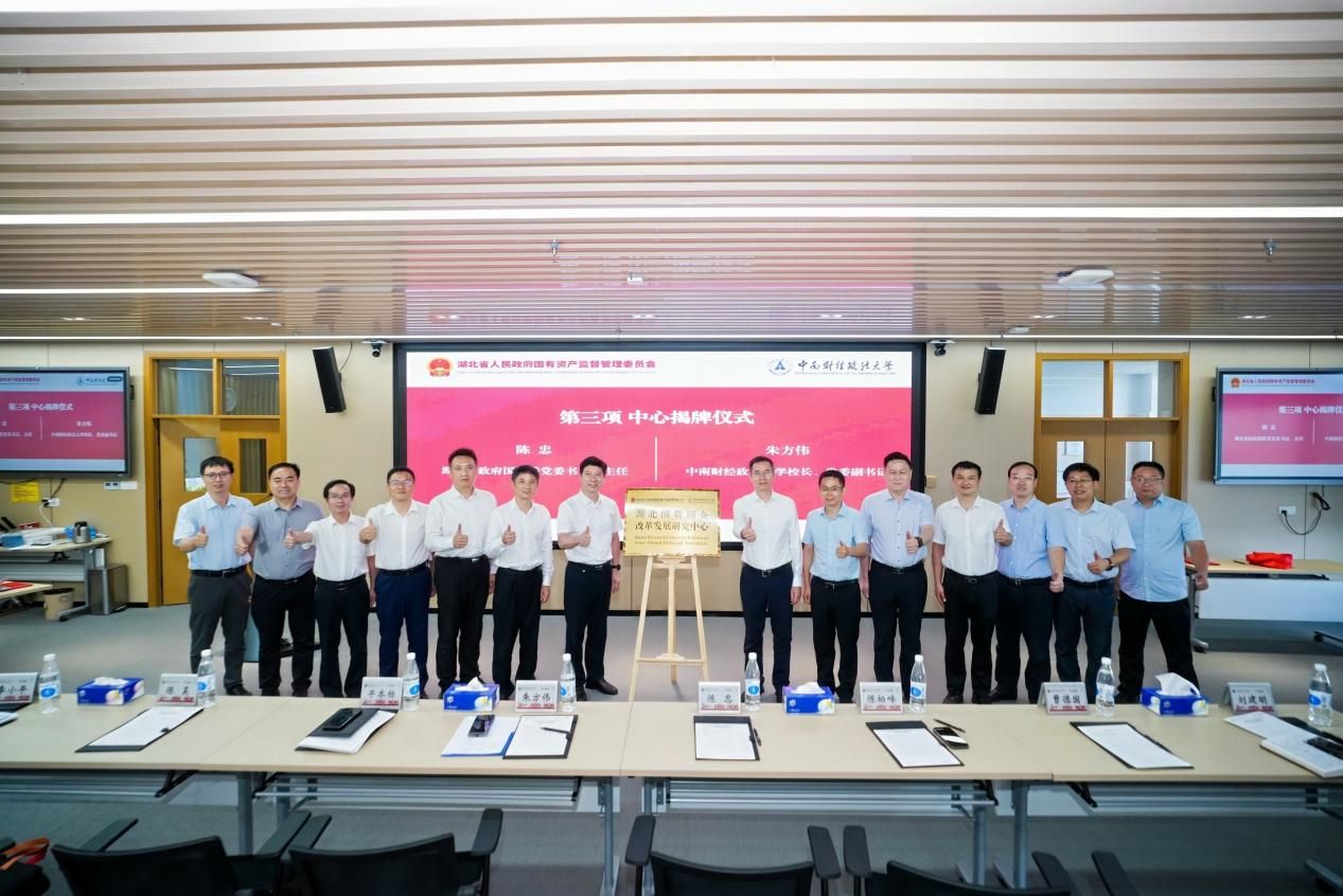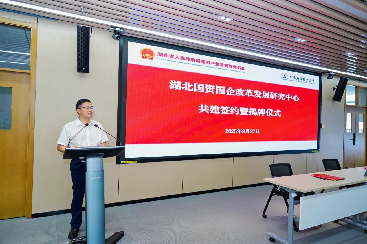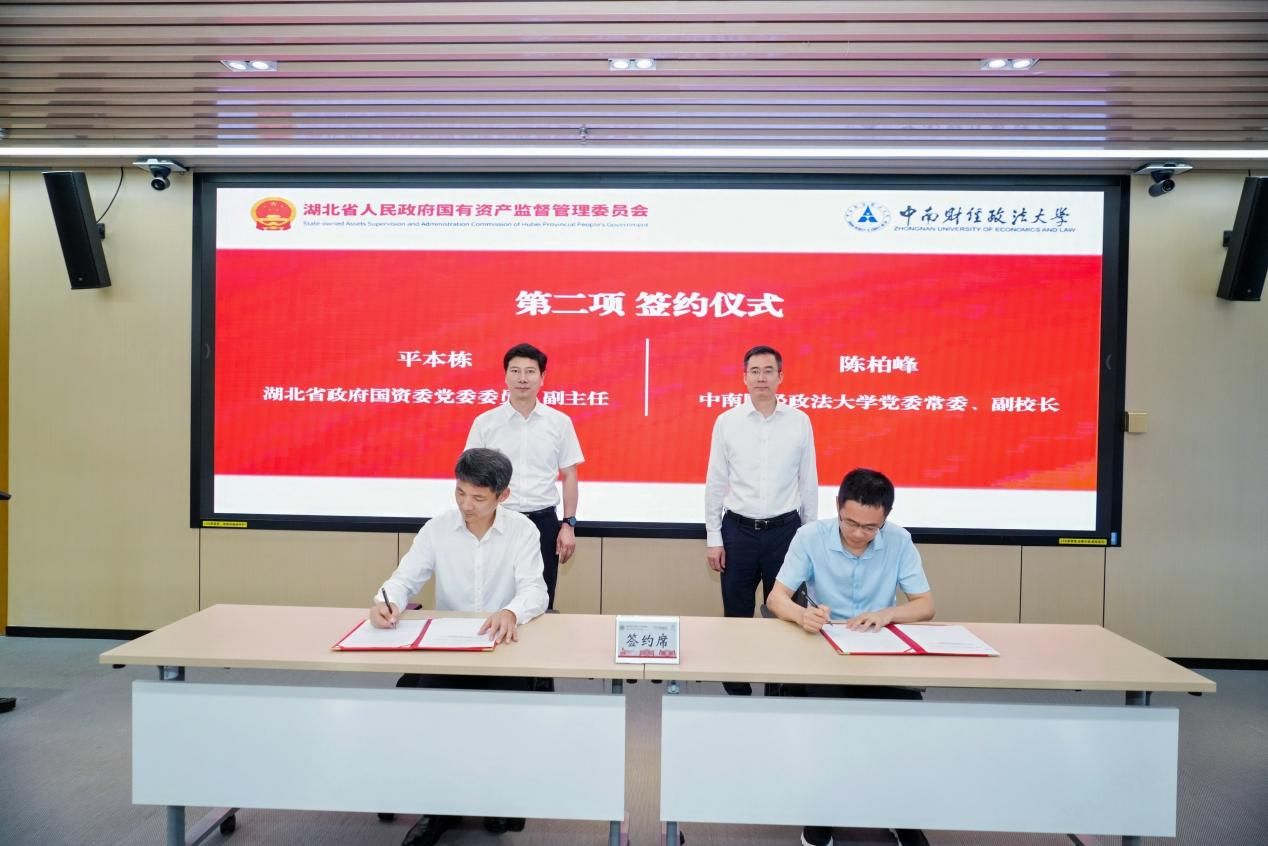 (通讯员 王娟娟)2025年8月27日上午,中南财经政法大学与湖北省人民政府国有资产监督管理委员会(以下简称“湖北省国资委”)签署战略合作框架协议,共建湖北国资国企改革发展研究中心(以下简称‘研究中心’),并为研究中心揭牌。中南财经政法大学校长、党委副书记朱方伟,湖北省国资委党委书记、主任陈忠出席签约揭牌仪式并致辞。中南财经政法大学党委常委、副校长陈柏峰,湖北省国资委党委委员、副主任平本栋出席签约仪式。中南财经政法大学校长助理、科研部部长李小平主持签约仪式。