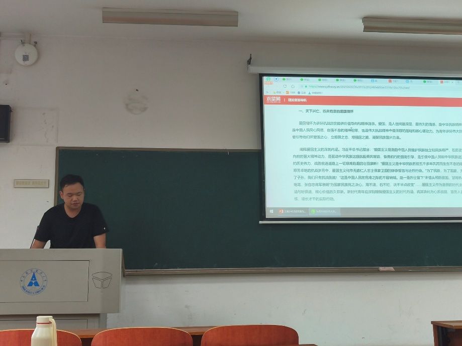 勿忘国殇警钟长鸣,矢志复兴青年力行。今年是中国人民抗日战争暨世界反法西斯战争胜利80周年。马跃同学播放九三阅兵视频,让同学们沉浸式感受到国家的富强与繁荣,接着带领全班同学共同学习共青团中央文章,引导同学们认识到:在实现民族复兴的新征程上,青年一代肩负着特殊的历史使命,需要从抗战精神中汲取力量。各位同学深入学习伟大抗战精神,在新时代背景下,同学们将坚定青年爱国主义信念,在民族复兴的新征程上不懈奋斗。