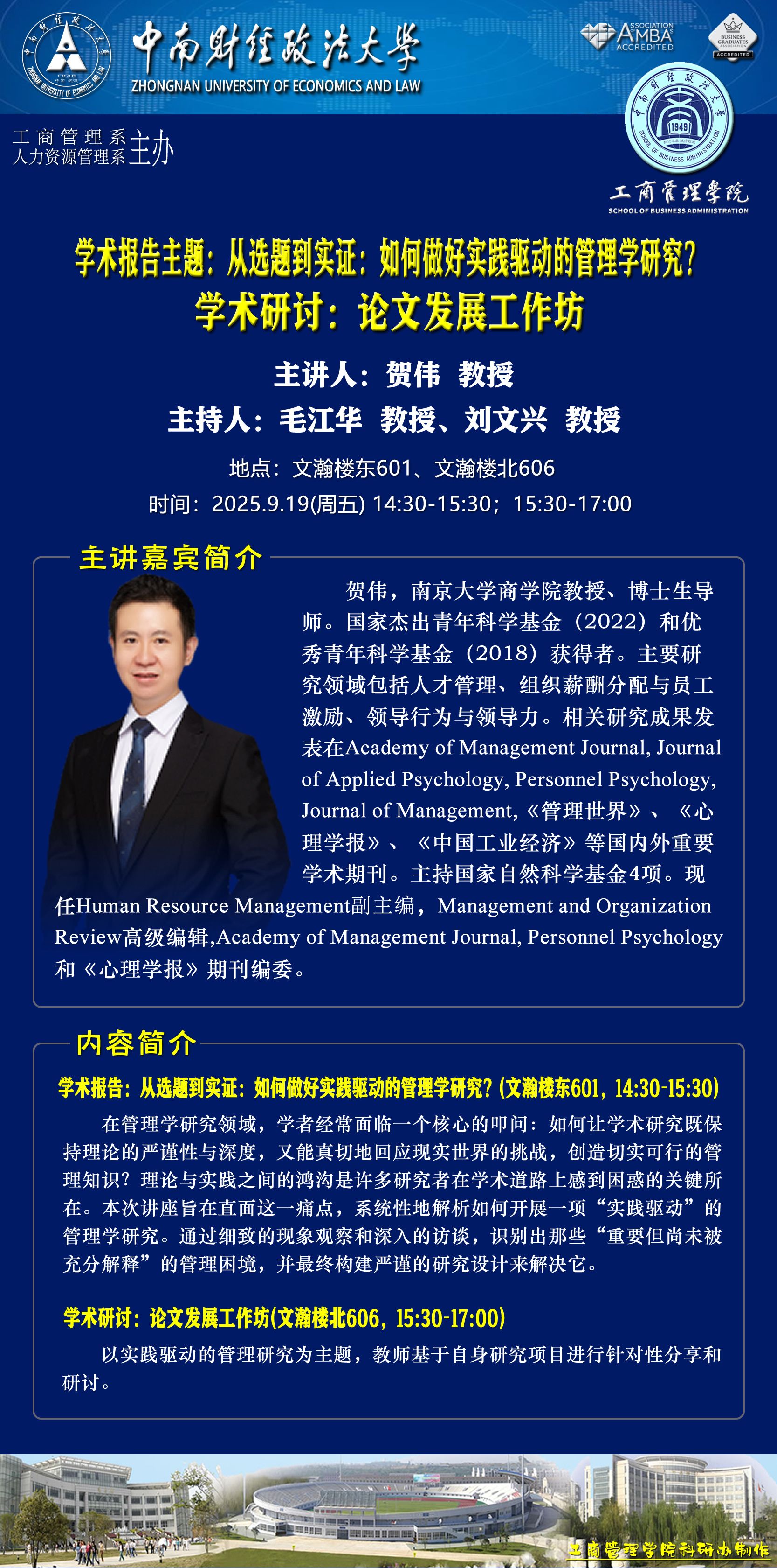 2025.09.19 14:30-16:30 | 文瀚楼东601 | 工商管理系 人力资源管理系 | 毛江华 教授;刘文兴 教授 | 贺伟 教授 | 从选题到实证:如何做好实践驱动的管理学研究? 学术研讨会:论文发展工作坊 |