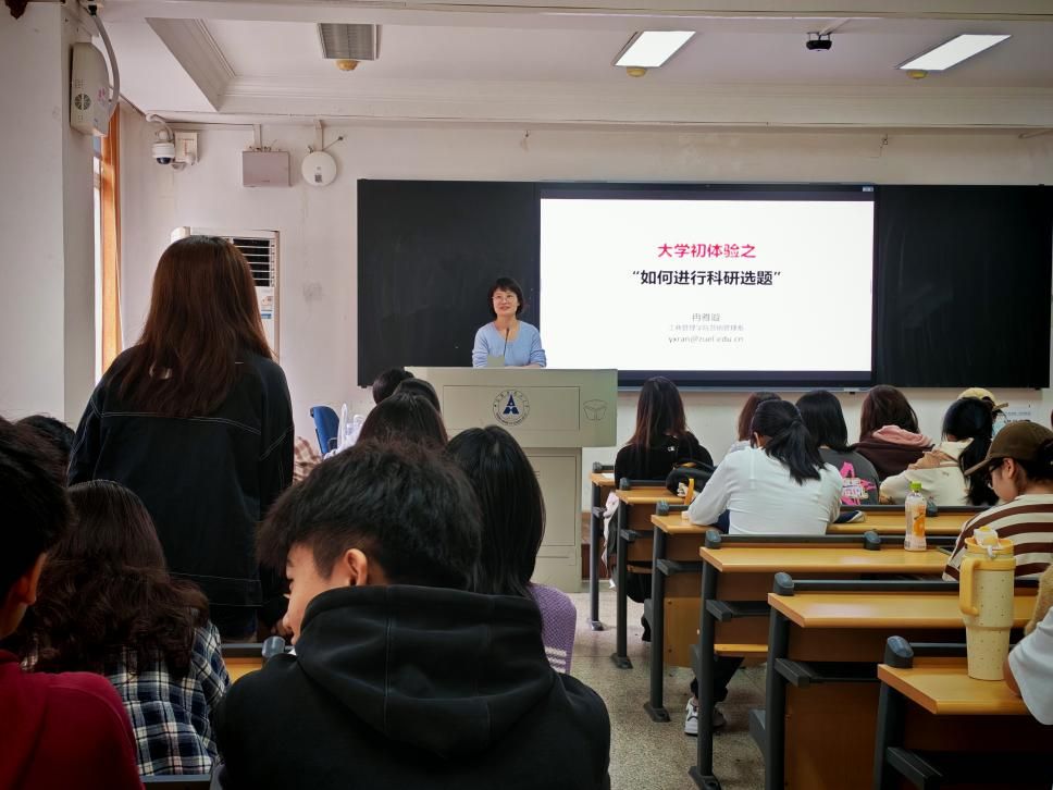 接下来,冉老师向我们分享了如何进行科研选题,包括获取文献资料的渠道、选题标准等丰富内容。除了学校图书馆的知网,冉老师还推荐了众多国内外期刊网站等多种获取学习资源的途径。同时,冉老师还给大家分享了一些贴近生活的研究案例,让同学们在惊喜之余,发现“科研并非遥不可及”,加深了大家对工商管理类专业的认识。冉老师还通过讲述自己大学时期在科研中找到自我价值的个人经历,鼓励大家多多参与博文杯、大创等科研比赛,将所学知识运用到实践当中。