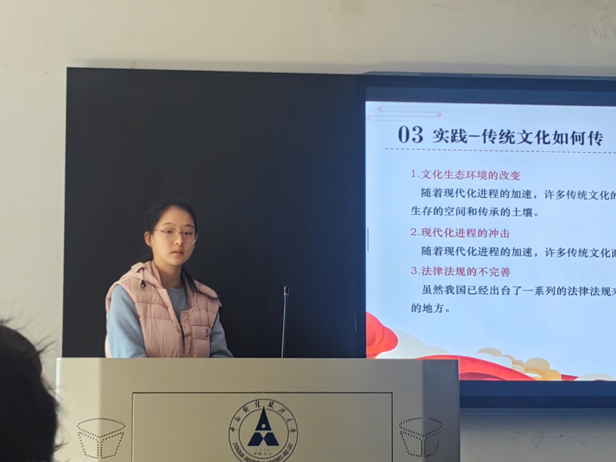 在第二部分,副班长刘思言同学聚焦“传统文化”这一主题。刘思言同学别出心裁地从同学们熟悉的武汉本土文化进行切入。生动介绍了传统文化的丰富内涵,并深入探讨了在当代青年中实现创造性转化、创新性发展的传承路径,要以“知”奠基,以“行”致远,让传统文化在新时代焕发新的生命力。