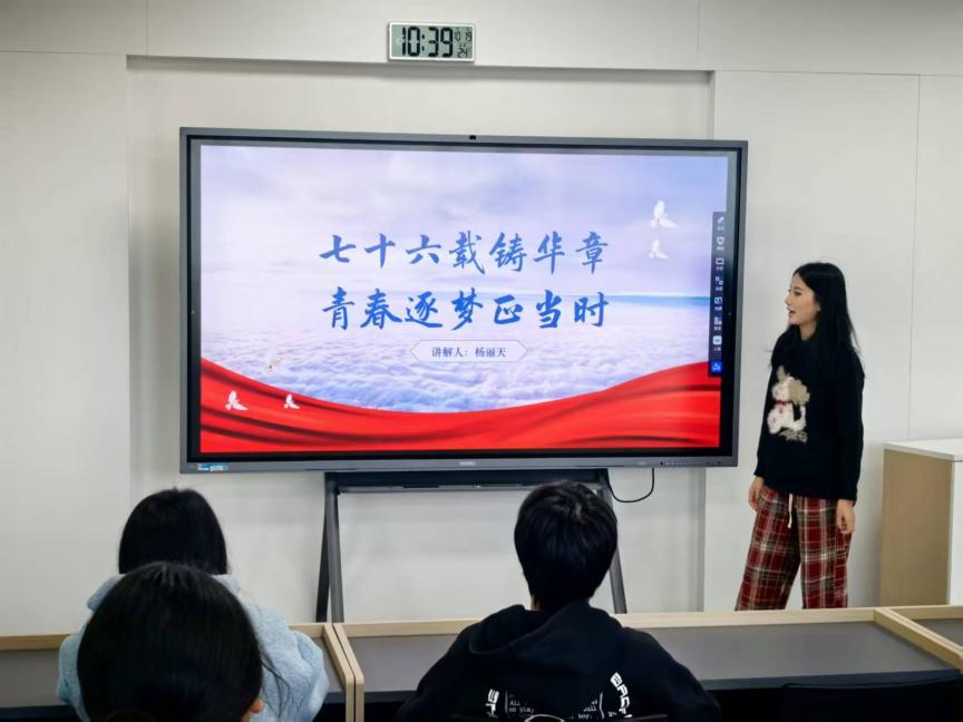 心理委员杨丽天以“七十六载铸华章,青春逐梦正当时”为主题,梳理了中国共产党从新民主主义革命时期(1921-1949)、社会主义革命和建设时期(1949-1978)、改革开放和社会主义现代化建设新时期(1978-2012)到中国特色社会主义新时代(2012-至今)的发展脉络,结合新中国史“站起来、富起来、强起来”的演进历程,帮助同学们明晰国家发展轨迹,增强民族自豪感。