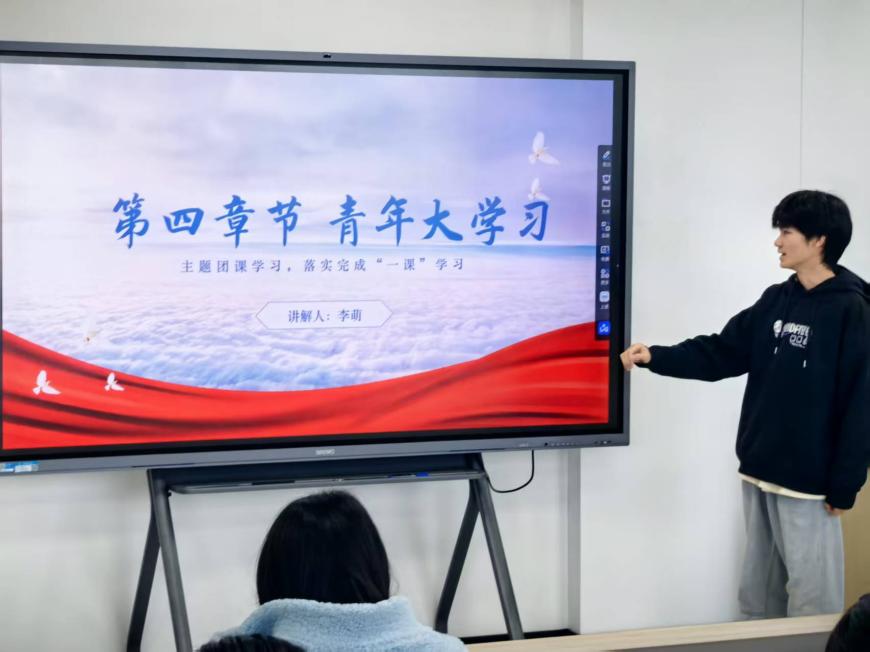 在理论学习与内容讲解后,团支书李萌带领全体同学开展“青年大学习”主题团课学习。他通过梳理学习要点,确保每位同学都能及时跟进党的最新理论成果,进一步强化政治素养,将“挺膺担当”的信念转化为思想自觉。