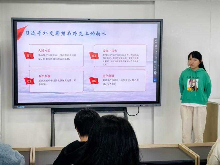 班长刘诗蕊聚焦构建人类命运共同体主题,解读习近平外交思想的10大精髓,包括“以维护世界和平、促进共同发展为宗旨推动构建人类命运共同体”、“以共商共建共享为原则推动‘一带一路’建设”等核心内容,并结合大国关系、发展中国家合作等方向,帮助同学们拓宽国际视野,理解中国外交理念。