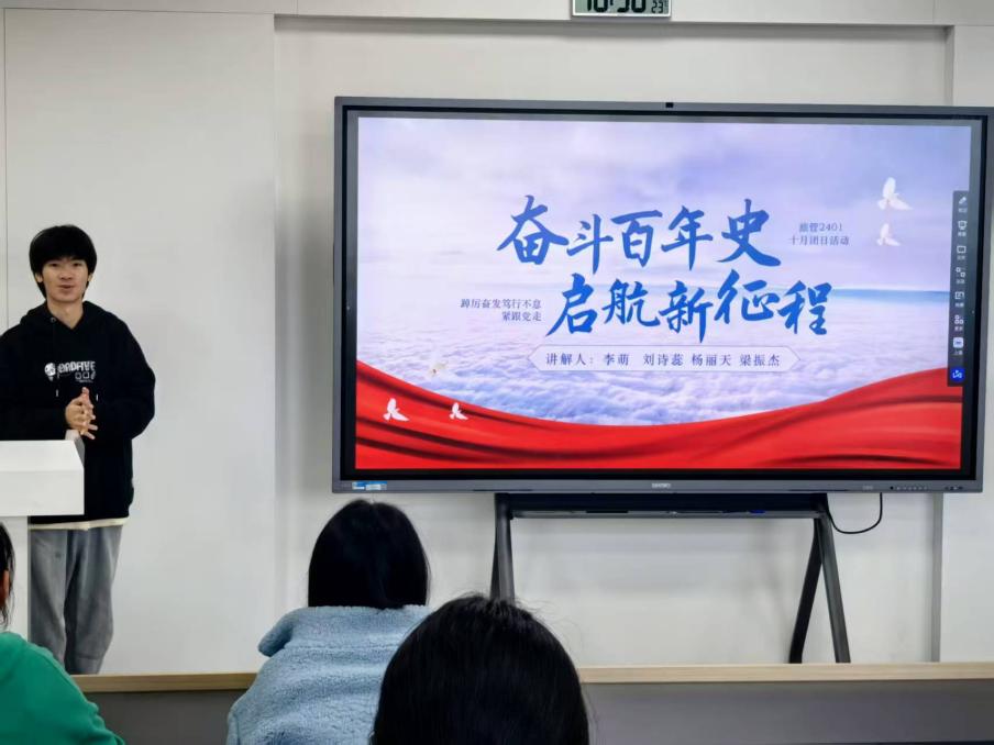 (通讯员 史娅琴)为深化支部成员对党的历史与理论认知,坚定“挺膺担当”的理想信念,明确新时代青年使命,旅管2401团支部于10月19日上午,在文瀚楼东601教室开展“学史明志守初心,文化铸魂向未来”主题团日活动,团支部全体成员参与。