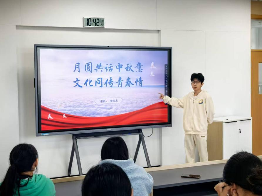 志愿服务委员梁振杰进行第二部分“月圆共话中秋意,文化同传青春情”的讲解。他先介绍中秋节赏月、吃月饼、团圆的传统习俗与文化内涵,再践行“两个结合”理念,提出青年可通过短视频讲嫦娥传说、设计国潮月饼包装、举办线上团圆雅集等创新形式,让传统节日文化融入现代生活,为文化传承注入青春活力。