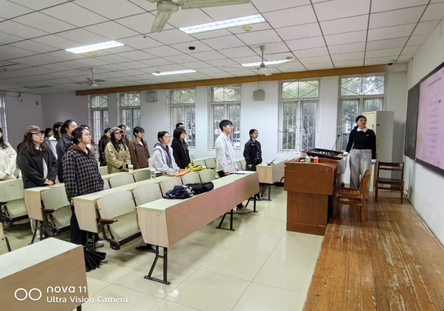 活动以全体团员合唱团歌拉开序幕。激昂的旋律响起,全体团员起立,神情庄重地齐唱《光荣啊,中国共青团》。大家带着饱满的热情演唱,歌声整齐嘹亮,既展现了当代青年的精神风貌,也为活动奠定了积极向上的基调。