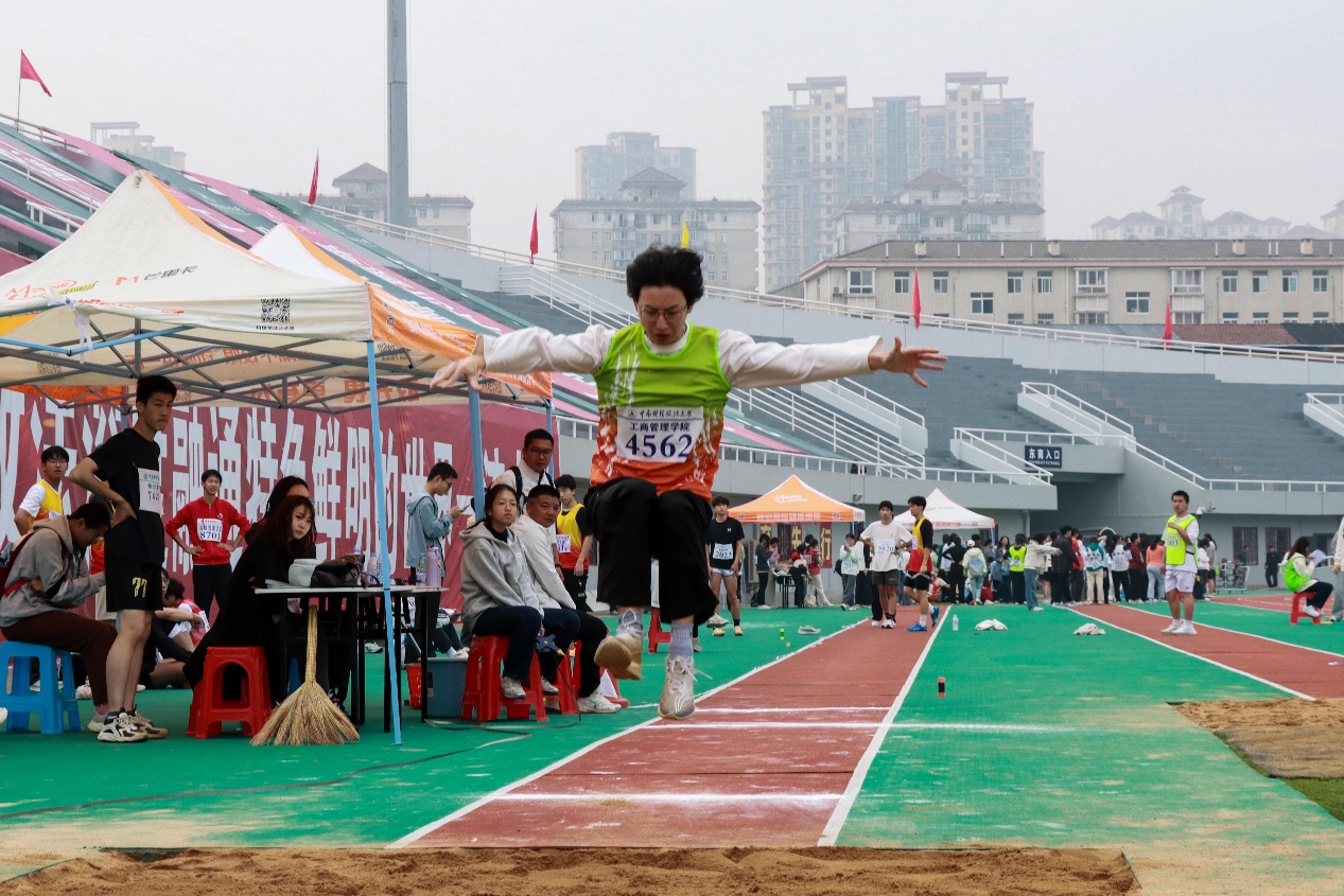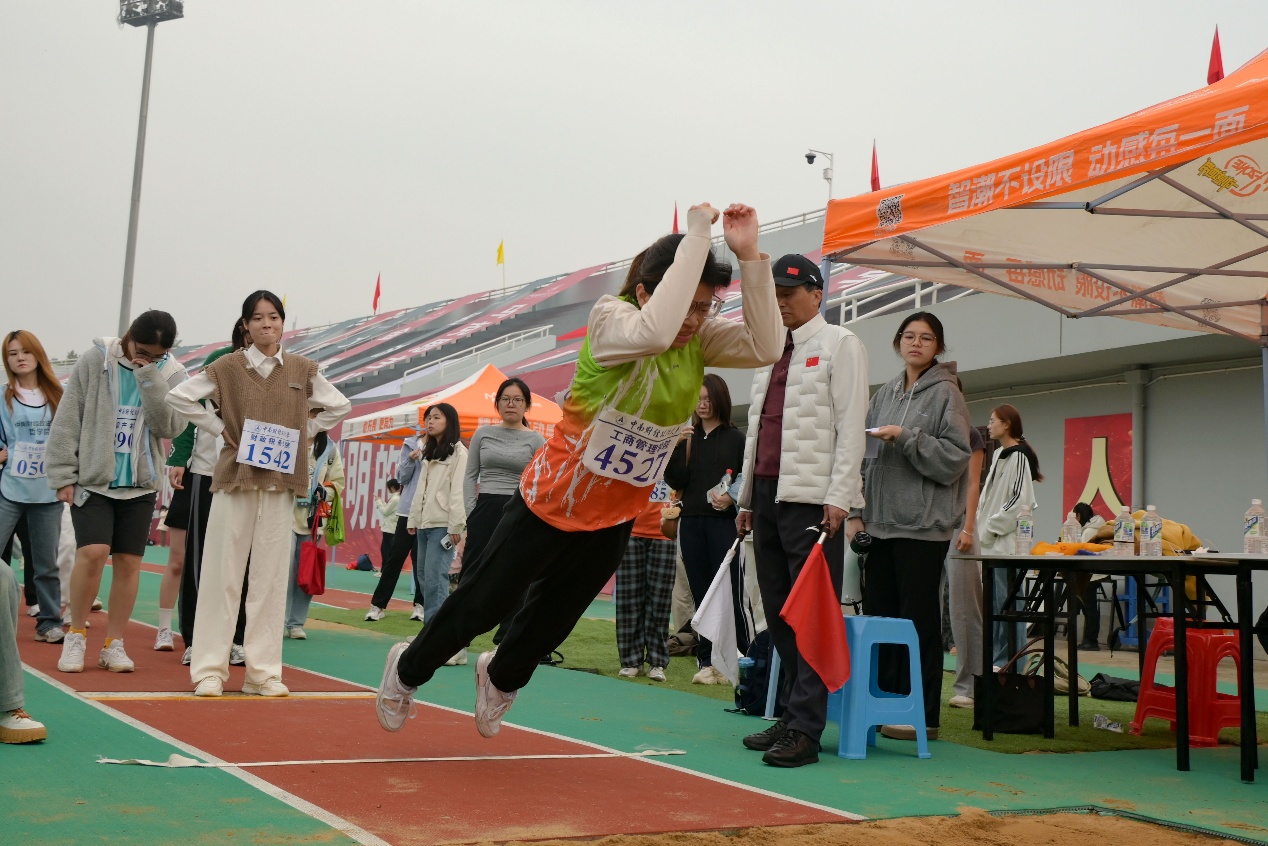 蓄力摆蹬,跨步凌空。沙坑扬起的尘土见证着袁梓丹的每一次奋力拼搏。在男子三级跳远决赛中,他用一次次跳跃展现着工商学子卓越的风采。