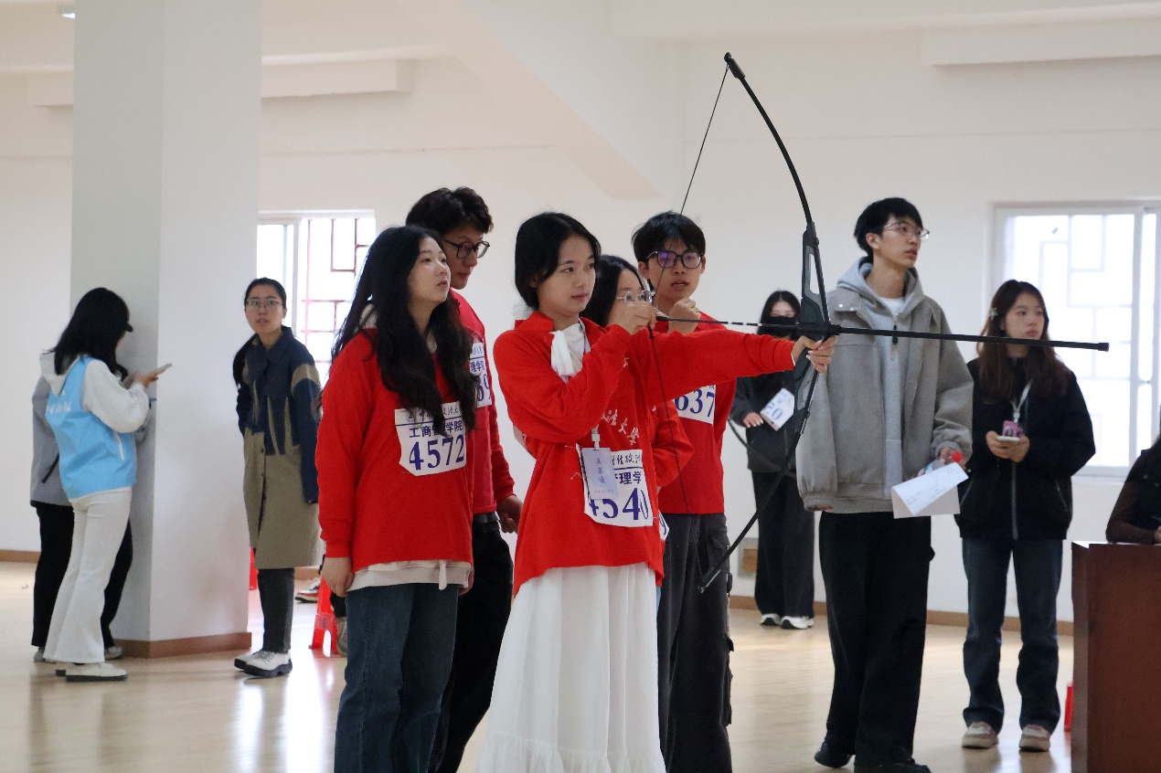 凝神聚气,拉动弓弦,瞄准靶心。面对本届大运会新增的特色竞技项目,工商健儿们以沉稳的心态、齐心的合作、亮眼的表现为工商拿下一分又一分。