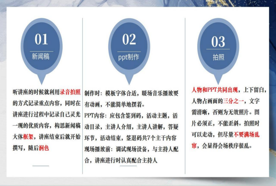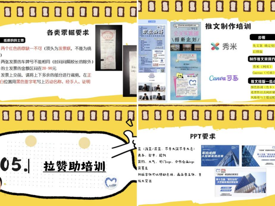 随后,会议进入专项培训环节。副部长马晨曦围绕简报制作展开培训,强调了其作为工作成果展示与信息传递载体的重要性,并详细讲解了结构要素与格式规范。副部长陈若颖则聚焦报账流程与海报设计,从票据整理、审批要求到设计思路进行了细致说明。